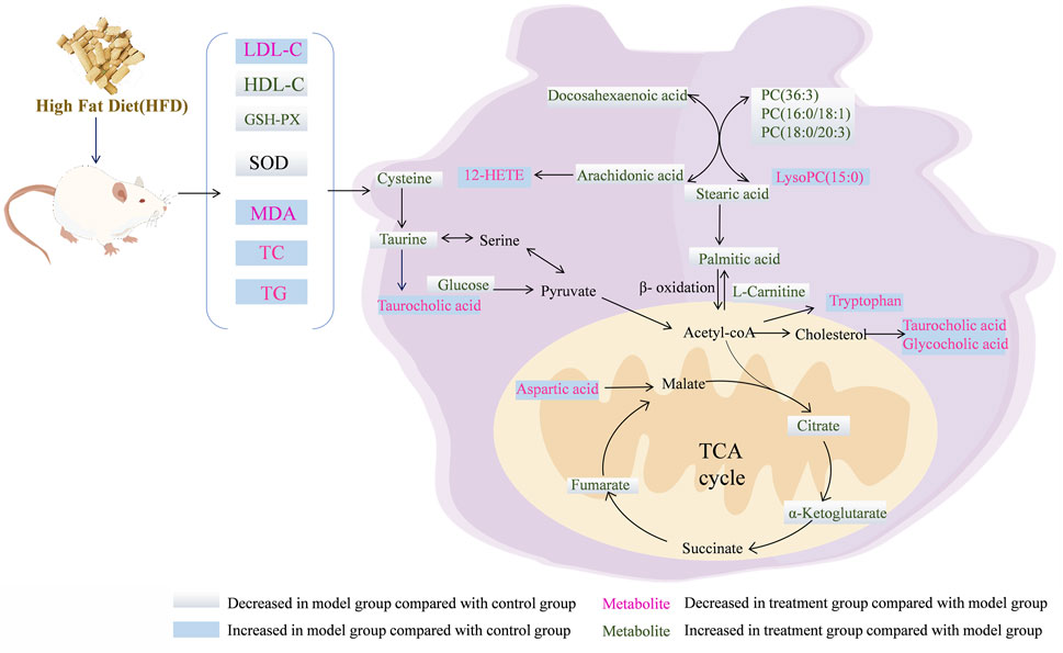 Figure 7. Overview of the metabolites and the major metabolic pathways in the NAFLD model after treatment with the RG.