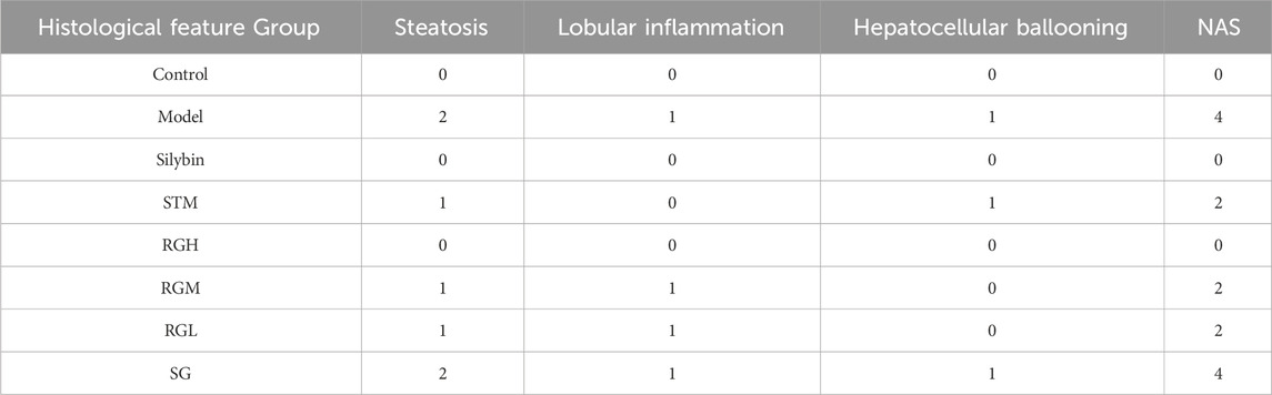 Histopathological results helped to visualize the therapeutic effects of the three herbal monomers on HFD-induced NAFLD. As shown in Figure 3C, in the control group of rats, the hepatic lobules were normal, with clear hepatic sinusoids and normal nuclei. There was no hepatic steatosis or inflammatory cell infiltration. The rats in the model group presented damaged hepatic lobules, with dilated hepatic sinusoids, hepatic steatosis, and missing nuclei, which are typical of liver injury. Moreover, the inflammatory cell infiltrate was obvious. These findings coincided with the histopathological observations of NAFLD, suggesting that the HFD-induced NAFLD model was successfully established in this study. Inflammatory cell infiltration and lipid droplet formation in hepatocytes improved after treatment with STM, RGH, RGM, or RGL. Different treatment groups showed different levels of improvement, and each presented a reduction in cell necrosis rates and alleviation of hepatic steatosis. Notably, the RGH group presented the most significant ameliorative effects. No improvement was observed in the SG group. The NAS score results are presented in Table 1. As shown in Figure 3D, the percentage Oil Red O-stained area in the model group was dramatically greater than that in the control group, whereas the corresponding percentages in the STM, RGH, RGM, and RGL groups were markedly lower than those in the model group. The above findings indicated that the NAFLD model was successfully established and that STM, RGH, RGM, and RGL were effective against NAFLD. The RGH group showed the most significant improvement, while no significant improvement was observed in the SG group.