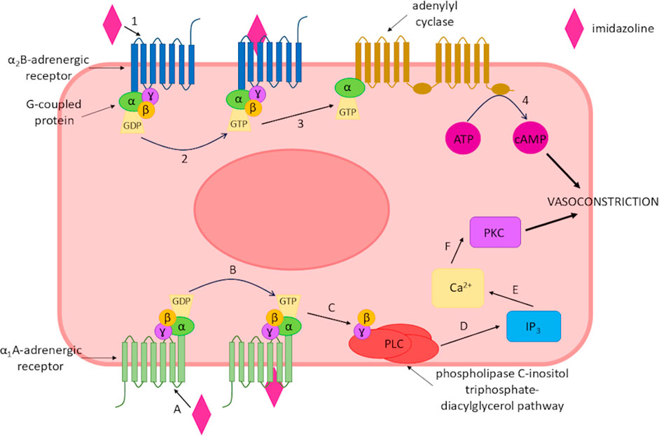 Figure 2. Imidazoline-triggered activation of α-adrenergic receptors leading to vasoconstriction of smooth muscle. Binding of an imidazoline derivative to the α1A-adrenergic receptor. (A) activates the receptor (B), this subsequently activates the phospholipase C-inositol triphosphate-diacylglycerol pathway (C,D), which increases intracellular calcium (E) and activates protein kinase C (F) leading to vasoconstriction of the smooth muscle. Alternatively, an imidazoline derivate binds to α2B-adrenergic receptor (1), resulting in receptor activation (2) which subsequently increases adenylyl cyclase (3) and cAMP production (4) leading to vasoconstriction.