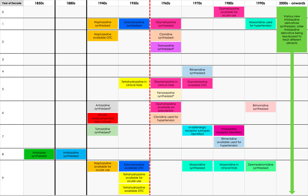 Figure 4. Timeline of discovery of imidazoline derivatives. Red dashed line represents the point where there is a gradual shift from early-generation to new-generation imidazoline derivatives, which can be defined as such: early-generation imidazoline derivatives were created prior to 1960, typically have higher risk of side effects, longer subjective onset of action, are shorter acting and require higher or more frequent doses. New-generation imidazoline derivatives were created after 1960, typically have fewer side effects, greater tolerability, a subjective faster onset of action, are longer acting, requiring lower or less frequent doses, and have greater α-adrenergic receptor affinity and potency. *Represents imidazoline derivatives which are less widely used and so more are difficult to define in such terms.