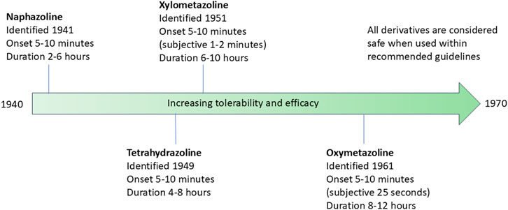 Figure 5. Timeline of the identification of the four most widely studied imidazoline nasal decongestants. The timeline indicates the date of identification, the onset of action and duration of action. The tolerability and efficacy of the nasal decongestions improves with each subsequent derivative.