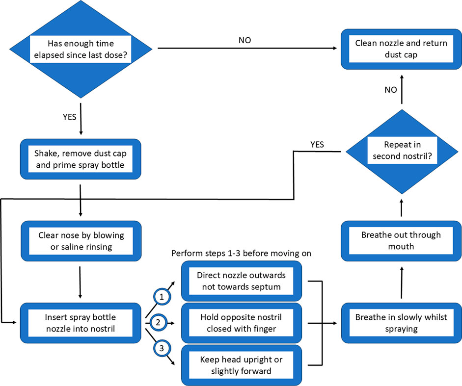 A general internet search for “how to use a nasal spray correctly?” provides a wealth of videos and images from a variety of sources, which aim to portray the best method to achieve the most effective results. One method of providing information to patients is through the inclusion of leaflets alongside medication however, this is not mandated worldwide thus there is the possibility that patients may not be made aware of potential risks (Young et al., 2017). Moreover, where leaflets are received, they often differ in terms of readability (Okoro, 2022). Whilst receiving an information leaflet alongside medication appears to be beneficial, with most patients taking the time to read them the first time they use the medication, they are less frequently checked when subsequent packs are opened thus updated information can be missed. Additionally, the language used within these leaflets can be difficult to access for some patients due to factors such as overwhelming amounts of information, technical language usage and relevance to the patient (Barrias et al., 2024). The use of pictorial representations and visual aids may facilitate patient understanding and comprehension rather than text format alone. Whilst, this has little impact on adherence, it has the potential to positively improve health outcomes (Schubbe et al., 2020). Given the potential risk which may arise from the accidental ingestion of imidazoline nasal decongestants, it would be worth considering simplifying the information received by patients. Making use of a combination of visual aids and text could help facilitate correct use, improving not only efficacy but also tolerability. An overview of how to approach the optimal use and delivery is described in Figure 6.