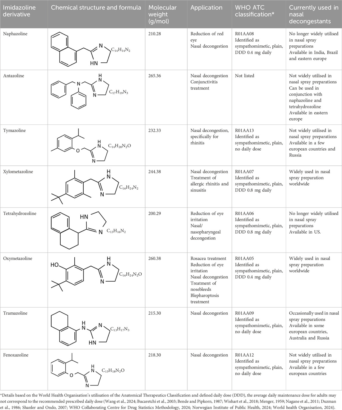 Other imidazolines have been identified as having nasal decongestant properties (Table 1), although these are less widely used for this purpose than those previously described. Antazoline, synthesised in 1946 is an imidazoline and first-generation antihistamine, that is used in nasal decongestants often alongside other imidazolines, for the treatment of allergic rhinitis and hay fever (Bende and Pipkorn, 1987; Boora, 2007). In addition, it is used to treat eye and skin irritation due to allergies, has potential anti-viral properties and may help in the treatment of arrhythmia (Bende and Pipkorn, 1987; Boora, 2007; Li et al., 2021; Springer et al., 2024). Similarly, the imidazoline derivative tramazoline, synthesised in 1962, functions as a nasal decongestant with a similar efficacy to xylometazoline but lacks the wider range of uses seen in other imidazolines (Hochban et al., 1999; Maryadele et al., 2007). Synthesised in 1947, tymazoline has nasal vasoconstrictor properties which are effective against rhinitis symptoms. However, it is not widely utilised and other uses have not been determined (Maryadele et al., 2007; Wishart et al., 2018). Fenoxazoline is the final imidazoline derivative that is used as a nasal decongestant for rhinitis. Synthesised in 1965, it functions in the same manner as other derivatives although is not as widely available (Bucaretchi et al., 2003; Maryadele et al., 2007).