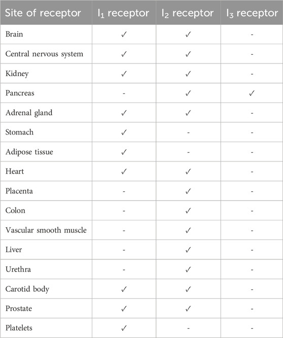 Table 2. Identified locations of imidazoline receptors in mammals including humans (Bousquet et al., 2020; Khan et al., 1999; Dardonville and Rozas, 2004; Ernsberger et al., 1995; Head and Mayorov, 2006; Regunathan and Reis, 1996).