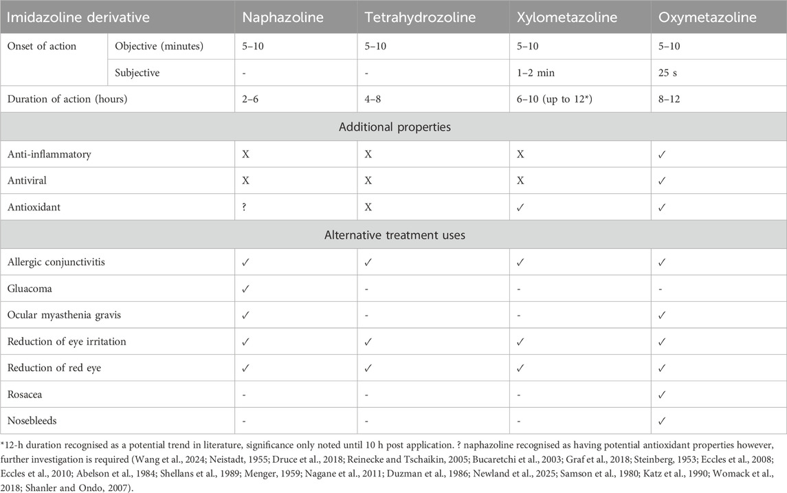 The need for drugs with greater efficacy, lower effective dose and a longer therapeutic window led to the production of another imidazoline, tetrahydrozoline hydrochloride, which following 4 years of clinical trials became available in 1959 (Neistadt, 1955; Menshawey and Menshawey, 2024). As with naphazoline, tetrahydrozoline also acts as a vasoconstrictor on the nasal mucosa and has an onset of action within 5–10 min of application. However, it provides the added benefit of having a prolonged effect, lasting between 4–8 h, thus requiring less frequent administration and has lower toxicity (Neistadt, 1955; Hutcheon et al., 1955; Bucaretchi et al., 2003).