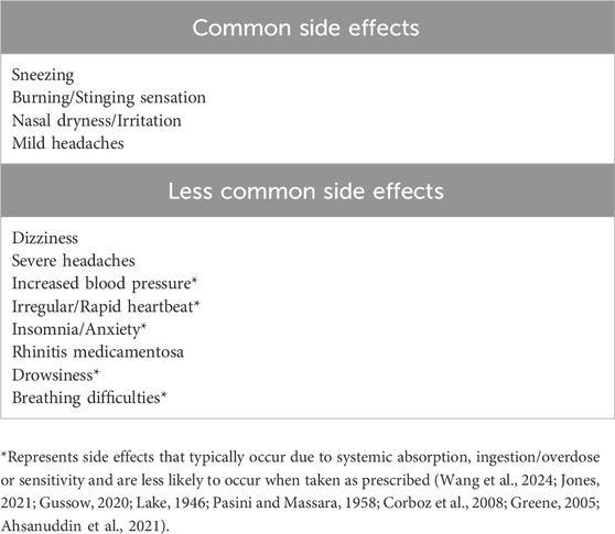 Ahsanuddin, S., Povolotskiy, R., Tayyab, R., Nasser, W., Barinsky, G. L., Grube, J. G., et al. (2021). Adverse events associated with intranasal sprays: an analysis of the food and Drug Administration database and literature review. Ann. Otol. Rhinol. Laryngol. 130 (11), 1292–1301. doi:10.1177/00034894211007222