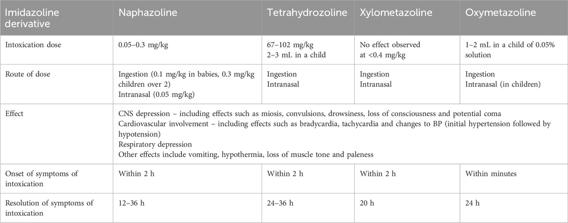 The first cases of acute toxicity after excessive self-medication with imidazoline nasal sprays were reported in 1946. Regardless of the imidazoline derivative used, the observed effects of intoxication are similar, and can include central nervous system and respiratory depression, alongside reduced heart rate and fluctuations in blood pressure. However, the dose required for intoxication to occur is often not well defined and varies between imidazoline derivatives. The onset of symptoms of intoxication are rapid and typically resolve within 24 h with suitable medical care (Table 5) (Cartabuke et al., 2021; Uehara et al., 2024; Oishi et al., 2024; Vitezić et al., 1994; van Velzen et al., 2007; Spiller and Griffith, 2008; Al-Abri et al., 2014; Musshoff et al., 2014; van Stralen et al., 2023; Nordt et al., 2016; Gussow, 2020).