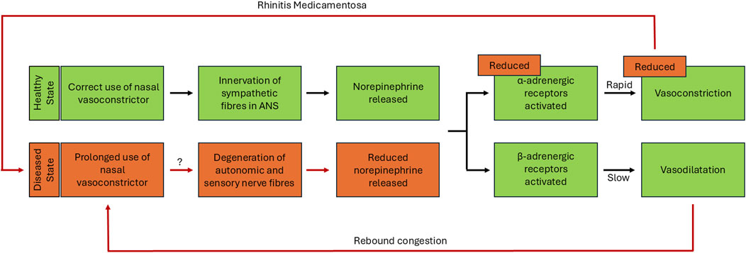 Figure 1. Hypothesised changes in innervation pathway during rhinitis medicamentosa. Representation of the sympathetic pathway leading to vasoconstriction and vasodilatation in healthy tissue and hypothesised changes within diseased tissue state. In the correct-use-phase, innervation of sympathetic nerve fibres within the nasal mucosa of healthy tissue results in the release of norepinephrine, which activates α- and β-adrenergic receptors leading to either vasoconstriction or vasodilation of the underlying nasal vasculature (shown in green). The vasodilatation which occurs after this correct-use-phase, can result in a rebound congestion driving the misuse of the vasoconstrictor, leading to the acute rebound phase (shown in green leading to red). If the use of nasal vasoconstrictors is further prolonged after this initial rebound phase, this finally results in the RM phase. The hypothesised changes to innervation pathway in the diseased state of rhinitis medicamentosa, causes a dysregulation in innervation, reducing norepinephrine release which leads to a reduction in the effectiveness of vasoconstriction provided by treatment (shown in red).