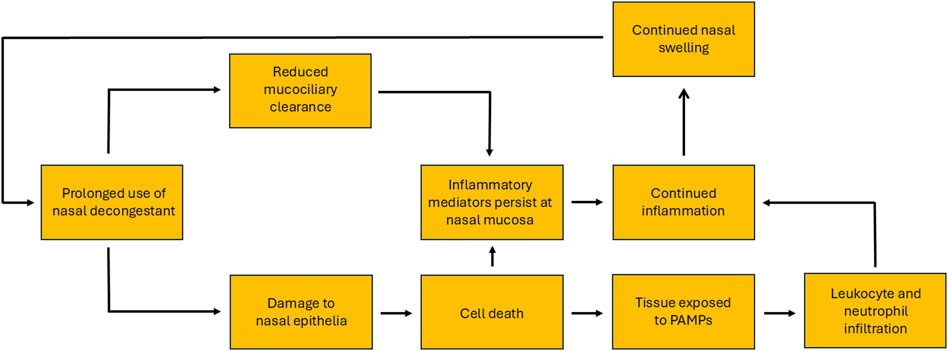 In animal models there is convincing evidence that treatment with imidazoline based nasal formulas result in changes to the nasal mucosa, including increased permeability of the basal lamina, severe damage to ciliated cells and oedema (Ramey et al., 2006; Elwany and Stephanos, 2010; Morissette et al., 2007; Suh et al., 1995; Talaat et al., 1981). Studies in rabbits have shown evidence of ulcerated epithelia, infiltration by inflammatory cells and the presence of oedema, which becomes more pronounced as treatment continues. Additionally, there is also evidence of potential cytotoxic and cytopathic effects and vacuolisation. The latter may enable the sequestration of the decongestant into the tissue, driving osmotic swelling and resulting oedema (Morissette et al., 2007; Suh et al., 1995). Whilst studies in guinea pigs have shown evidence of metaplasia of squamous cells, hyperplasia of goblet cells, oedema, infiltration by mononuclear cells and increases in secretory, vascularity and phagocytic activity (Ramey et al., 2006; Elwany and Stephanos, 2010). The evidence of such changes in humans is less clear. Studies on healthy subjects who used xylometazoline for 6 weeks showed no changes in morphology or mucociliary function (Petruson and Hansson, 1982). However, this was partly contradicted in later studies using either xylometazoline or oxymetazoline. Although both nasal vasoconstrictors were shown to cause no evidence of rebound swelling after 10 days of treatment, by 30 days rebound congestion was experienced by most participants. Interestingly, the number of times daily the nasal vasoconstrictor was used did not influence the likelihood of developing rebound congestion. Whilst rebound swelling was observed after prolonged treatment in both studies, there was no consensus on whether the effect is a direct consequence of vasodilatation or interstitial oedema. However, the evidence more strongly supports the latter theory (Graf and Juto, 1994a; Graf and Juto, 1995). More recent studies utilising electron microscopy have indicated that RM may result in chronic inflammation and hypersecretion, due to hyperplasia of goblet cells and increased epidermal growth factor (Lin et al., 2004). Additionally, nasal turbinate samples from RM sufferers showed loss of ciliated cells and changes to vascular endothelial layer, via disruption of the basal lamina and increased interstitial gap (Knipping et al., 2007). These latter observations may explain the reduced mucociliary clearance and oedema experienced in RM (Knipping et al., 2007; Lin et al., 2004) and supports the previous findings from animal models. The role the inflammatory cascade plays in RM is also unclear. However, the reduced mucociliary clearance observed in RM may result in inflammatory mediators persisting at the nasal mucosa (Passàli et al., 2006). Furthermore, the proposed damage to the nasal epithelia may subsequently cause cell death. This damage has the potential to activate the inflammatory cascade and create a loop. Not only causing localised inflammation but also exposing tissue to pathogen-associated molecular patterns (PAMPs) leading to infiltration by leukocytes and neutrophils (Figure 2). However, for some individuals with RM there is also an element of underlying allergy. This may influence not only the commencement of nasal vasoconstrictors but also the prolonged use, and may explain some of the observations relating to inflammatory response (De Corso et al., 2020).