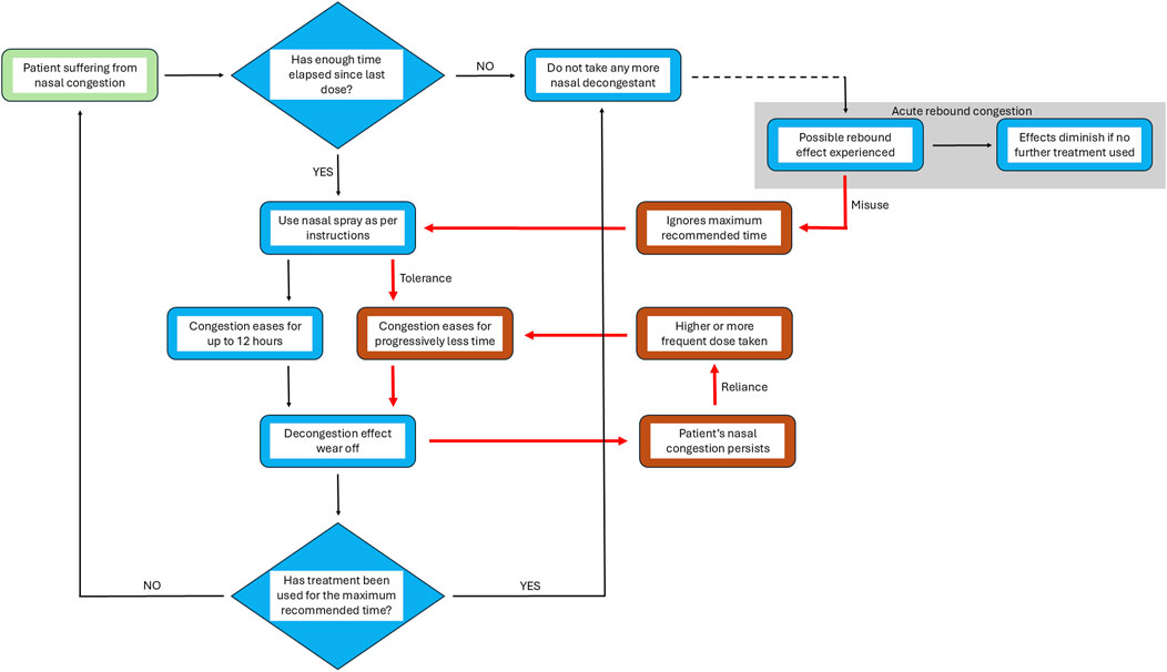 The reason why and how RM develops is not fully understood. However, there is a wealth of information suggesting that the prolonged use of imidazoline based nasal treatments plays a significant role, regardless of the mechanisms involved. The reason why individuals begin to take nasal vasoconstrictors excessively is potentially linked to the development of tachyphylaxis to the API in use. Development of a tolerance towards an imidazoline based nasal treatment results in a shortening window of relief with each dose. With xylometazoline, for example, the effectiveness of the treatment is reduced from 9 h to around 5 h after 30 days of use. This reduction in efficacy is linked to a potential reduction in affinity to the α-adrenergic receptors or a downregulation in their expression rather than a specific tolerance (Schäfer et al., 1995; Zheng et al., 2025). This development of tachyphylaxis to the API in nasal vasoconstrictors is a common experience for many patients. To continue feeling relief from nasal congestion, they increase the frequency and/or volume of dose, creating a cycle whereby their symptoms continue to deteriorate although they are being treated. This resulting prolonged use of nasal vasoconstrictors is potentially due to a lack of awareness by patients regarding the risk of developing RM if recommended limits are not followed. Thus there is little recognition that the cycle which is entered as a consequence of misuse is detrimental to their symptom relief (Eccles et al., 2008) (Figure 3).