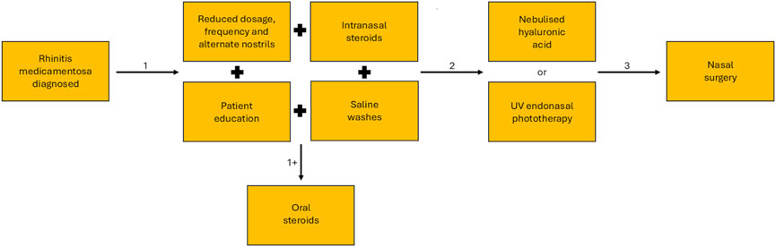 Figure 4. Treatment pathway for the resolution of symptoms of rhinitis medicamentosa. After initial diagnosis conservative methods of treatment (1) are used, this begins with phased weaning and may include saline washes, intranasal steroids and patient education, in some cases adjunct oral steroids may be required (+1). If conservative methods of treatment fail, alternative treatment methods may be tried (2) including nebulised hyaluronic acid and UV endonasal phototherapy. If less invasive methods are unsuccessful, the surgical intervention may be required.