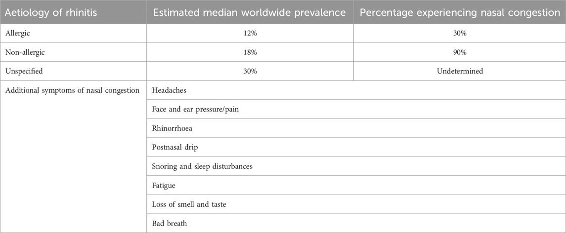 Table 1. Estimated prevalence of differing aetiologies of rhinitis and the extent to which nasal congestion is experienced. Patients experiencing nasal congestion, regardless of aetiology, may also experience a range of additional symptoms (Stewart et al., 2010; Bernstein et al., 2024; Savouré et al., 2022; Bhargava et al., 2011).
