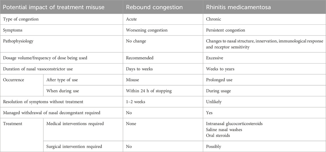 Table 2. Differences between rebound congestion and rhinitis medicamentosa which can result from the misuse or prolonged use of imidazoline based nasal treatments, the effects can be dependent on the API and formulation. Acute rebound congestion phase can progress to chronic rhinitis medicamentosa phase if nasal vasoconstrictor usage is not curtailed (Black and Remsen, 1980; Mortuaire et al., 2013; Lockey, 2006; Ramey et al., 2006; Wallace et al., 2008; Scadding, 1995; Graf, 1999; Graf and Juto, 1994a; Graf and Juto, 1995; Knipping et al., 2007; Lin et al., 2004; Zheng et al., 2025).