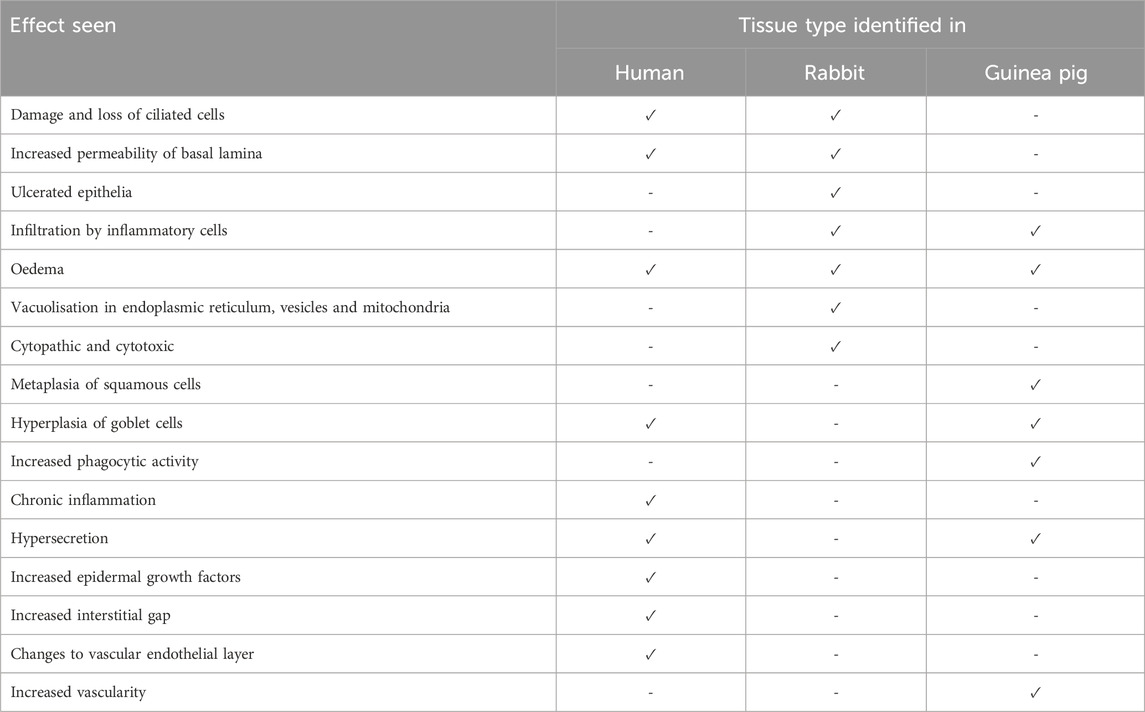 Table 3. Histological and immunological changes observed within the nasal mucosa after treatment with imidazolines. Rhinitis medicamentosa studies on different animal tissues show various changes to the nasal mucosa based on species observed in (Ramey et al., 2006; Graf and Juto, 1994a; Graf and Juto, 1995; Knipping et al., 2007; Lin et al., 2004; Passàli et al., 2006; Elwany and Stephanos, 2010; Morissette et al., 2007; Suh et al., 1995; Talaat et al., 1981; Petruson and Hansson, 1982; De Corso et al., 2020; Wang and Bu, 1991).