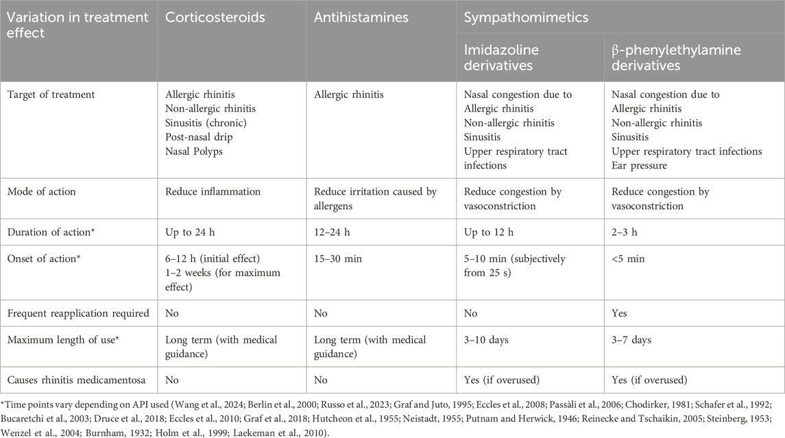The wide variety of topical nasal treatment available on the market, reflects the differences in the mode of action each provides. Furthermore, combining different types of nasal treatments may work synergistically, providing better relief for more persistent symptoms (Table 4) (Wang et al., 2024). The effectiveness of the sympathomimetics, and more specifically those which contain imidazoline derivatives, has made them one of the most widely available and utilised treatments for nasal congestion (Trinh et al., 2024). Sympathomimetics act by constricting the blood vessels in the nasal passageway relieving related congestion by reducing blood flow to the area (Wang et al., 2024). Part of the success of imidazoline derivatives is linked to their tolerability, with side effects experienced typically being minor when used correctly. Consequently, most individuals chose not to discontinue the product, as the benefits of treatment outweigh the minimal side effects. However, the limited side effects and overall good tolerability, relies on the patient taking the recommended dosage, for the maximum recommended time, to limit the likelihood of developing RM later on (Graf and Juto, 1995; Passàli et al., 2006; Chodirker, 1981).