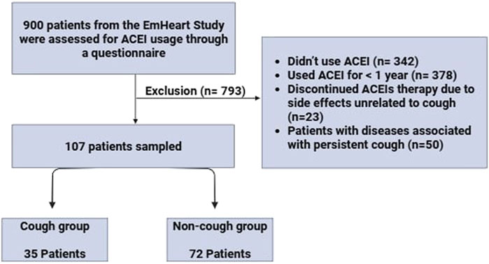 Flowchart showing the sampling process of the EmHeart Study. Nine hundred patients were assessed for ACEI usage. Seven hundred ninety-three were excluded for reasons like not using ACEI, using ACEI for less than one year, discontinuation due to unrelated side effects, or having diseases linked to persistent cough. One hundred seven patients were sampled, divided into a cough group with thirty-five patients and a non-cough group with seventy-two patients.