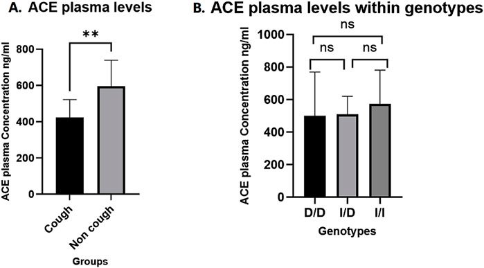 Figure 3. (A) Comparison of ACE plasma levels Between cough and non-cough groups. (B) Comparison ACE plasma levels across ACE I/D genotypes (D/D, I/D, and I/I genotypes). ** Indicates statistically significant difference (p < 0.05), ns: not significant.