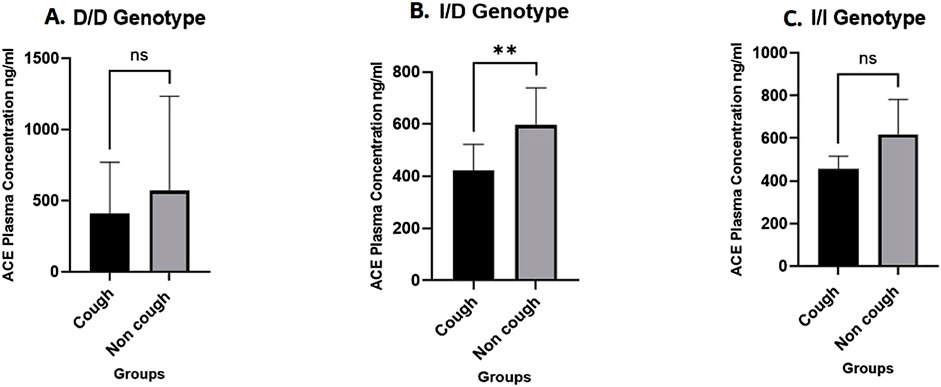 Figure 4. Comparison of ACE plasma levels by ACE I/D genotypes between the Cough and Non-cough Groups. (A) Comparison of ACE plasma levels within D/D genotype. (B) Comparison of ACE plasma levels within I/D genotype. (C) Comparison of ACE plasma levels within I/I genotype. ** Indicates statistically significant difference (p < 0.05), ns: not significant.