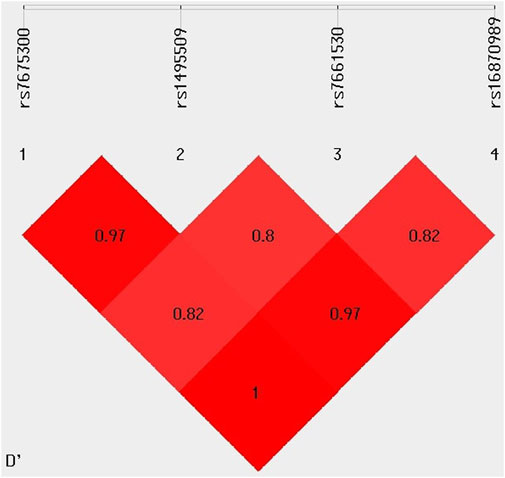 The LD analysis of four KCNIP4 variants (rs7675300, rs1495509, rs7661530, and rs16870989) revealed strong non-random associations between them. The D′ values indicated a high degree of co-inheritance, with rs7675300 and rs16870989 showing complete LD (D' = 1), and rs7675300 and rs1495509 demonstrating very strong LD (D' = 0.97). Similar strong linkage was observed between rs1495509 and rs16870989, suggesting that these variants are frequently inherited together within the study population. These findings are presented in Figure 5.