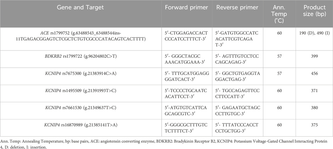 The genotypes of the ACE; rs1799752 I/D variant were determined through gel electrophoresis of the PCR products, as illustrated in Figure 2. The electrophoresis resulted in a 190 bp product corresponding to the D allele and a 490 bp product corresponding to the I allele. In heterozygote samples, both 490 and 190 bp bands were observed. Genotypes for BDKRB2; rs1799722 (C>T), and KCNIP4; rs7675300 (C>A), rs1495509 (T>C), rs7661530 (T>C), and rs16870989 (T>A) were identified by sanger sequencing using the BigDye Terminator Cycle Sequencing Kit (Applied Biosystems, Waltham, Massachusetts, United States). Sequencing analysis was conducted with the 3130xl Genetic Analyzer (Applied Biosystems, Waltham, Massachusetts, United States). The results were processed using Chromas software (Technelysium, Australia).