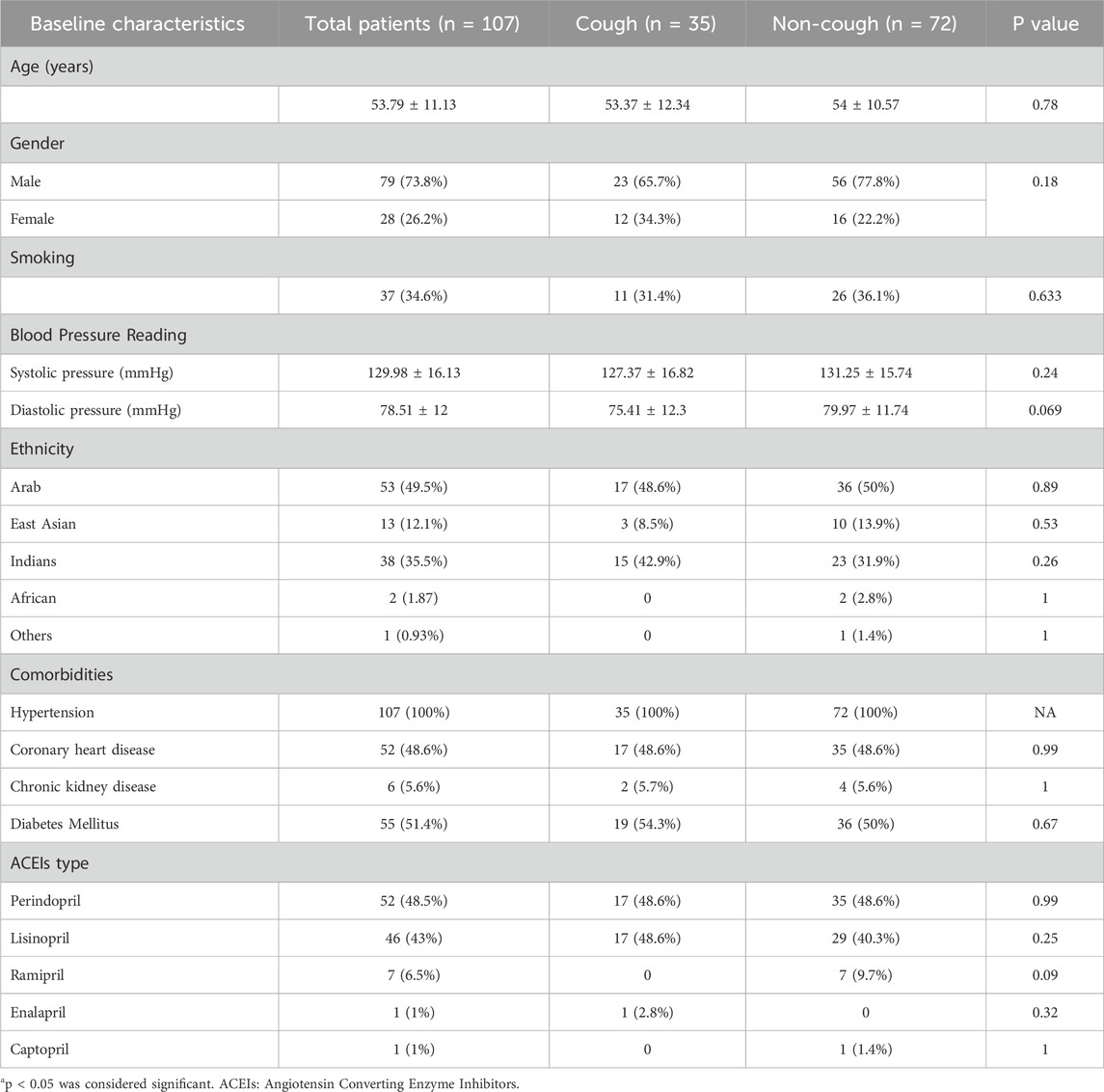 107 adult hypertensive patients were identified from the EmHeart study as ACEIs users and recruited for this study. The incidence of cough in our study was 32.7% (35 patients). The baseline characteristics and collected data, including demographics, comorbidities, and ACEIs type, are presented in Table 2. 73.8% of the participants were males, with no statistically significant difference in gender distribution between the cough and no-cough groups (P = 0.18). The average age across all patients was 53.79 (±11.13) years. Moreover, the participants represented a diverse ethnic background categorized into five distinct groups (Arabs, East Asians, Indians, Africans, and others). Coronary heart disease affected 48.6% of patients equally in both groups. Diabetes mellitus was slightly more common in the cough group (54.3%) than in the non-cough group (50%). Chronic kidney disease was the least prevalent, occurring in 5.6% of patients, with similar distribution in both groups.
