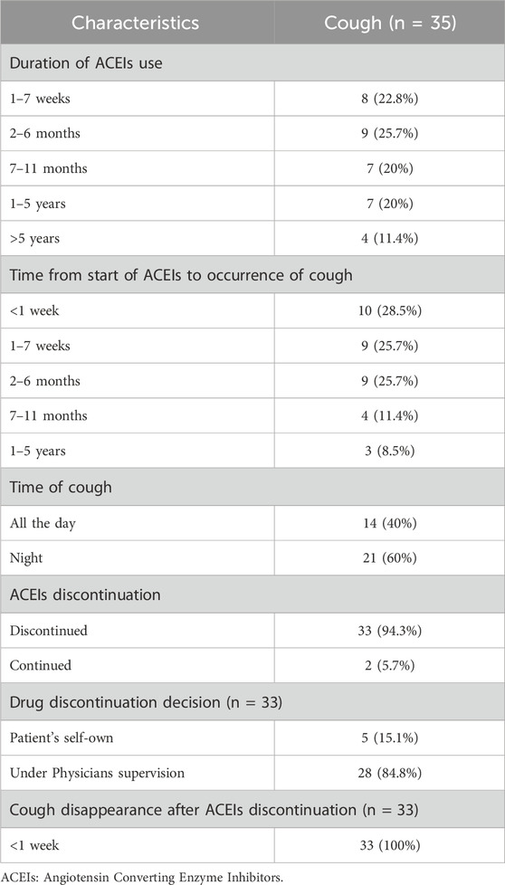 For patients in the cough group, information regarding the duration of ACEIs usage, onset of cough, and drug discontinuation is provided in Table 3. The duration of ACEIs usage varied, with the most common being 2–6 months and 1–7 weeks, each by 25.7% and 22.8% of the patients, respectively. A smaller percentage used ACEIs for longer durations. The onset of cough after starting ACEIs varied, with the highest percentages reported within the first week, 28.5%, and from 1–7 weeks to 2–6 months, each 25.7%. The cough occurred mostly at night in 60% of the patients. A total of 94.3% discontinued ACEIs due to the tolerable nature of the cough, and in all cases (100%), the cough resolved within less than 1 week after discontinuation.