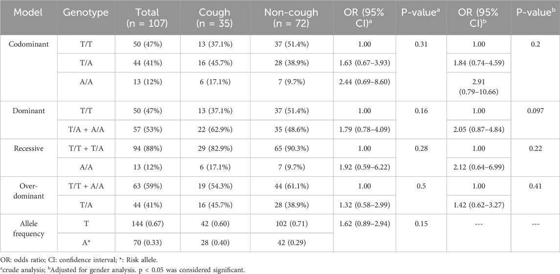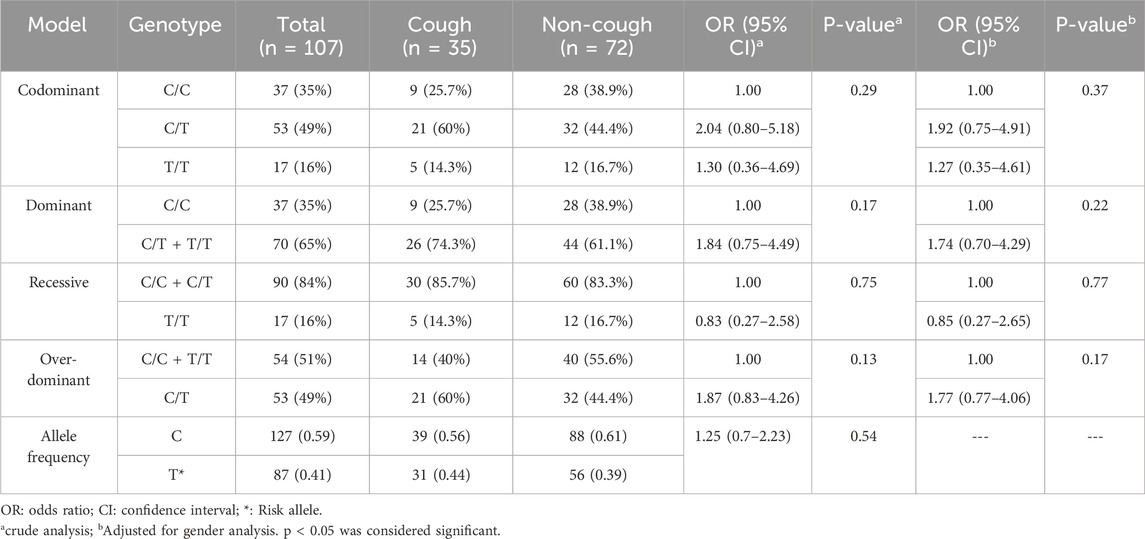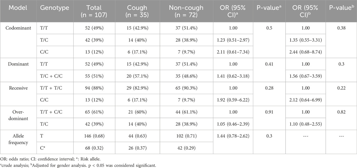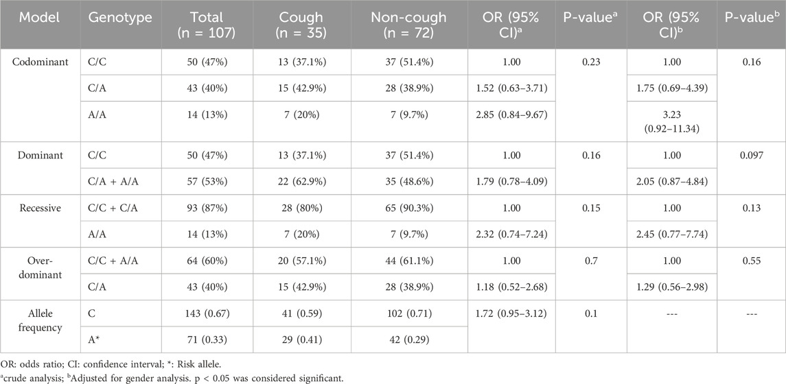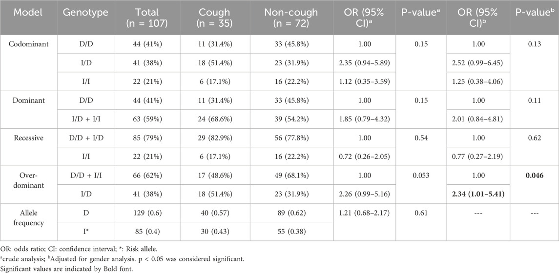 The genotype frequencies of ACE-rs1799752 I/D, BDKRB2-rs1799722 (C>T), and KCNIP4- rs7675300 (C>A), rs1495509 (T>C), rs7661530(T>C), and rs16870989 (C>A) variants were consistent with HWE in both cough and non-cough groups (p > 0.05). Detailed results are presented in Supplementary Table S1. Tables 49 present the crude analysis, as well as the analysis after adjusting for the confounding factor (gender) for the variants. The analysis was conducted using various genetic models, including codominant, dominant, recessive, and over-dominant models.