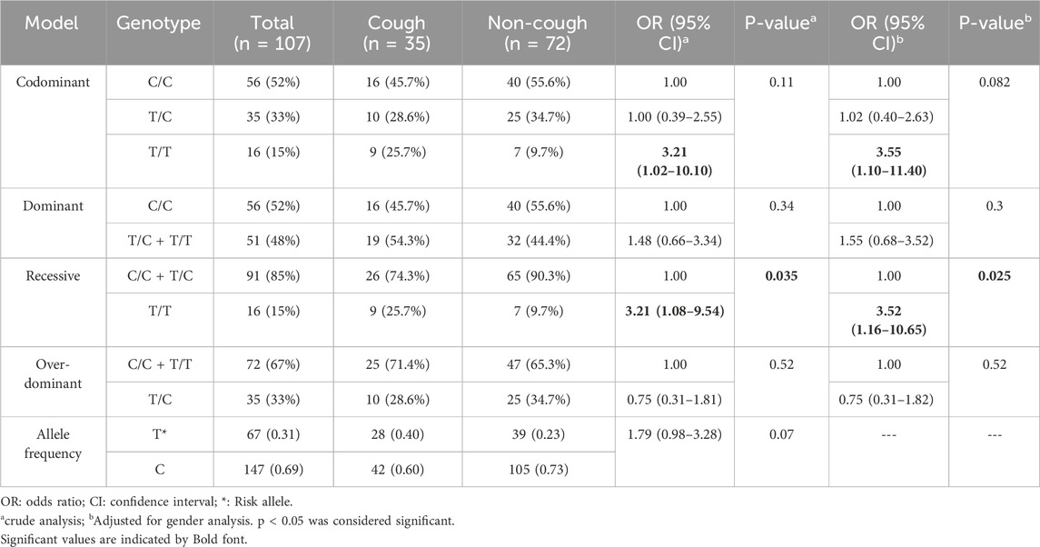 The genotypic and allelic frequencies of the KCNIP4 rs7661530 (T>C) are presented in Table 8. Among this variant, 26% were T/T, 29% were T/C, and 45% were C/C in the cough group. Among the non-cough, 10% were T/T, 35% were T/C, and 55% were C/C. The frequency of the T allele was 0.40 in the cough group and 0.23 in the non-cough group. Although a higher frequency of the T allele was observed in the cough group compared to the non-cough group, indicating an increased risk of ACEI-induced cough for the T/T genotype (OR = 3.21), this result did not reach statistical significance in the codominant model (p = 0.11). However, the recessive model shows a statistically significant association between the T/T genotype and ACEI-induced cough in both the crude and adjusted analyses. In the crude analysis, patients with the T/T genotype have a significantly increased risk of ACEI-induced cough compared to those with the combined C/C and T/C genotypes, with an OR of 3.21 and a p = 0.035. Similarly, in the adjusted-to-gender analysis, the T/T genotype is associated with a significantly increased risk of cough, with an OR of 3.52 and a p = 0.025.