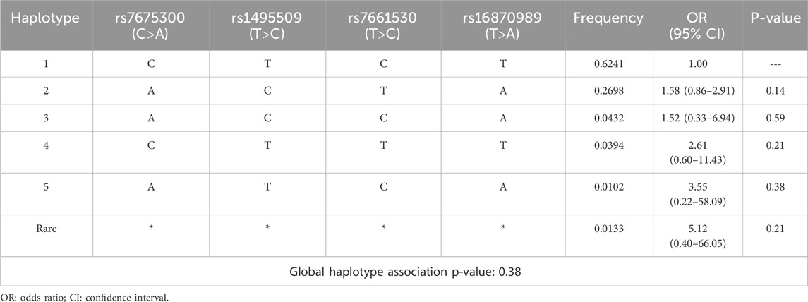 Haplotype analysis was performed to investigate the combined effect of the KCNIP4 variants (rs7675300, rs1495509, rs7661530, and rs16870989) on ACEI-induced cough.