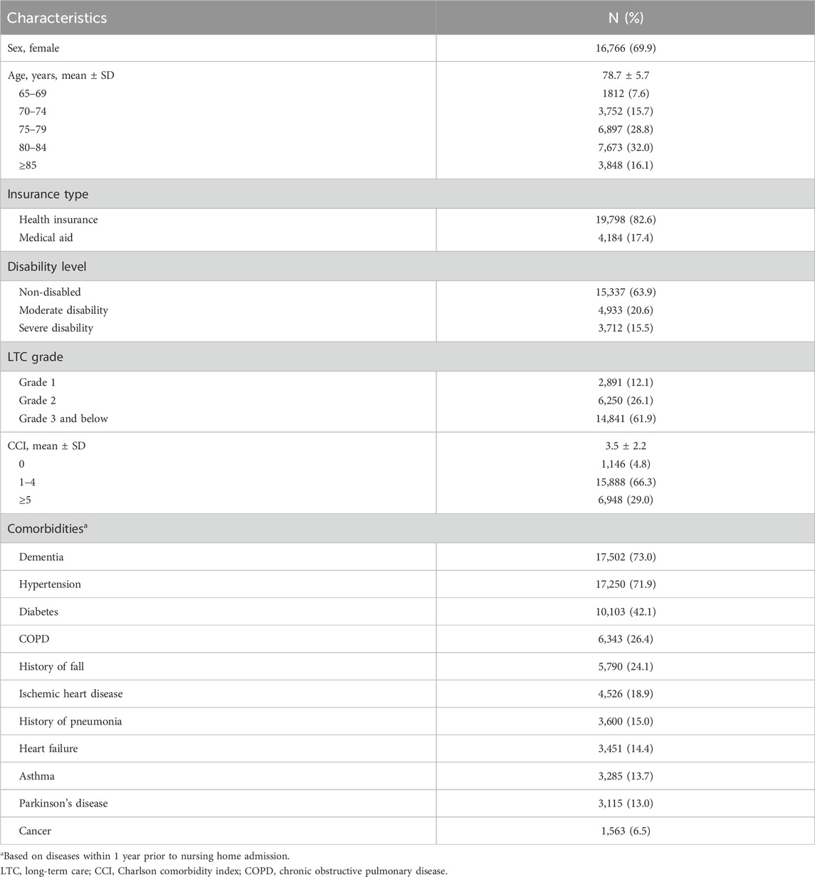 Our study included 23,982 older adults admitted to NHs between July 2008 and December 2018. Over half of the participants were aged 75–84 years, and approximately 70% were female. The most common comorbidities were dementia and hypertension, affecting 73.0% and 71.9% of the residents, respectively (Table 1). Within the first year of admission, 9,438 (39.4%) residents were discharged; 22% were due to hospitalization, and 6.6% were due to mortality. The highest rate of discharge occurred in the first quarter (Figure 1).