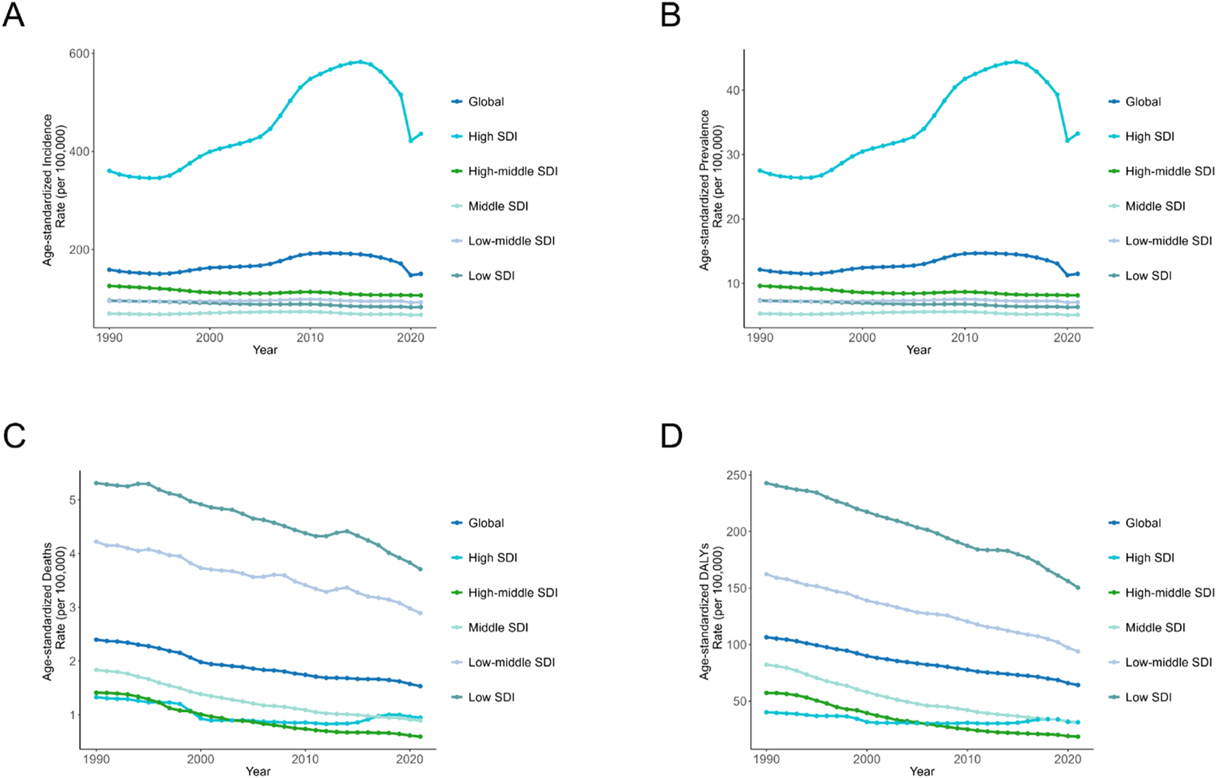 Age-Standardized Rates of Incidence, Prevalence, Deaths, and DALYs Due to Adverse effects of medical treatment, by SDI Quintiles for Both Sexes, 1990–2021. (A) Incidence. (B) Prevalence. (C) Deaths. (D) DALYs. DALYs: Disability-Adjusted Life Years; SDI: Socio-Demographic Index.