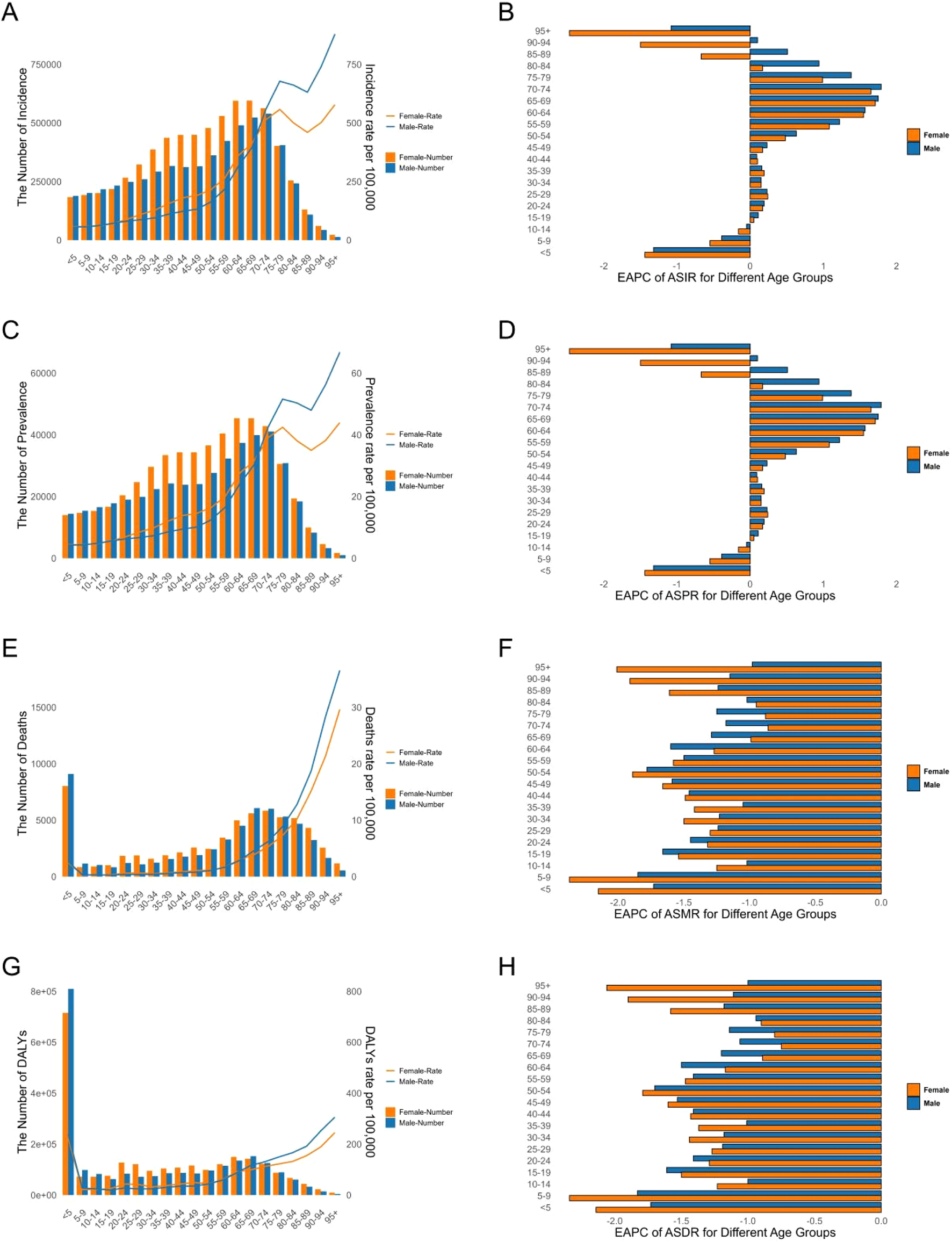 Age-Standardized Rates of Incidence, Prevalence, Deaths, and DALYs, Along with Their Estimated Annual Percentage Change (EAPC) from 1990 to 2021, in Adverse effects of medical treatment Across countries. (A,B) Incidence. (C,D) Prevalence. (E,F) Deaths. (G,H) DALYs. DALYs Disability-Adjusted Life Years.