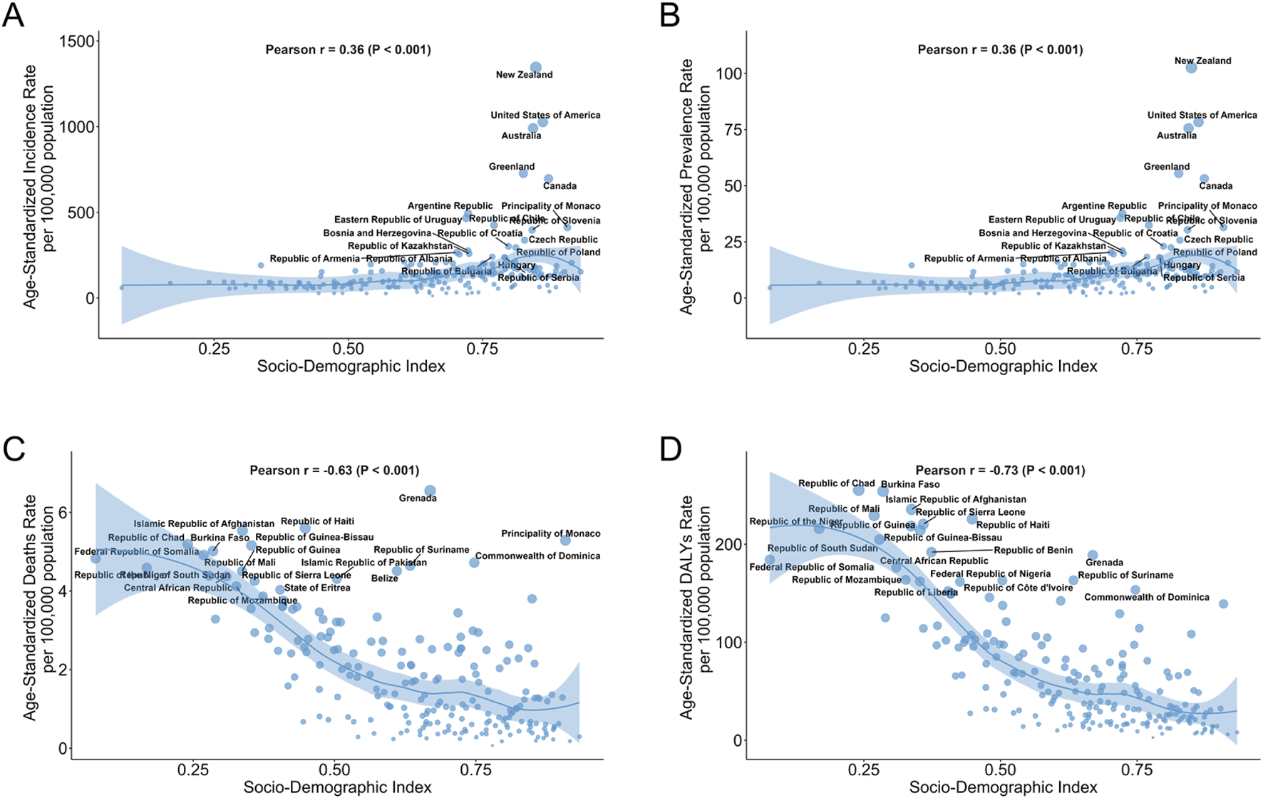 The socio-demographic index (SDI) serves as a composite metric ranking national development levels across populations. This standardized metric ranges from 0 (least developed) to 1 (most developed), derived through min-max normalization of constituent indicators. SDI is based on three indicators: (Kamath et al., 2024): lag-distributed income per capita; (Brennan et al., 1991); educational attainment for people aged 15 and above and (De Vries et al., 2008) total fertility rate for women aged under 25. In this study, we classified regions and countries into five quintiles of SDI.