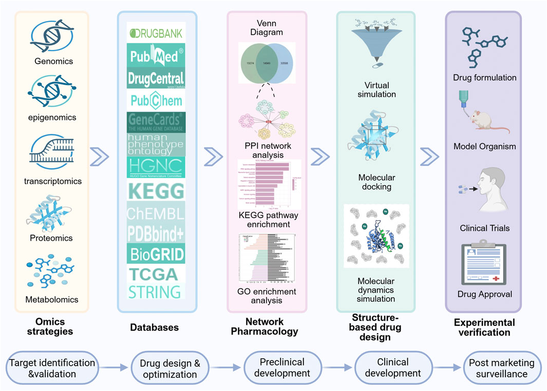 Omics technologies (such as genomics and proteomics) reveal disease-related molecular characteristics through high-throughput data, but using them is challenging due to data heterogeneity and a lack of standardization (Liu X. et al., 2024). For example, while compound screening based on the Chemical Entities of Biological Interest (ChEBI) database identified targets like TREM1 and MAPK1, incomplete data made it harder to validate the results (Alibakhshi et al., 2023). Bioinformatics utilizes omics data via algorithms, aiding target identification and elucidation of mechanisms (Mallick et al., 2017; Gudivada and Amajala, 2025). For instance, a Clustered Regularly Interspaced Short Palindromic Repeats–CRISPR-associated protein 9 (CRISPR–Cas9) functional genomics screen of 324 cancer cell lines prioritized targets by integrating genomic biomarkers, including microsatellite instability (MSI). However, algorithms struggle to fully grasp the complexity of biological systems, which can lead to prediction errors (Behan et al., 2019). Building on these insights, NP constructs drug-target-disease networks through systems biology methods, facilitating the development of multi-target therapeutic strategies. Research indicates that multi-target xanthine oxidase inhibitors can synergistically lower uric acid production and reduce adverse reactions (Yi et al., 2023). Meanwhile, natural multi-target neuraminidase inhibitors exert antiviral effects by regulating pathways such as Toll-like receptor 4 (TLR4) and Interleukin-6 (IL-6), significantly broadening the understanding of drug action mechanisms (Cao et al., 2024). However, their predictive performance heavily depends on experimental validation. For example, verifying how parthenolide (PTL) affects breast cancer (BC) pathways requires molecular docking, MD simulation, and both in vivo and in vitro experiments; without such validation, false-positive results may occur (Shi et al., 2024). The final stage involves molecular docking and MD simulation to improve the accuracy of drug design through atomic-level interaction analysis. For instance, Molecular Mechanics/Poisson–Boltzmann Surface Area (MM/PBSA) calculations show that phytochemicals have a binding free energy of −18.359 kcal/mol with Asialoglycoprotein receptor 1 (ASGR1), indicating strong binding affinity (Gao et al., 2023). Additionally, optimization methods for tankyrase inhibitors can guide structural improvements of new anti-cancer drugs (Kamal et al., 2014). However, simulations can be sensitive to force field settings and are difficult to replicate under real-life conditions, limiting their clinical translation potential (Chen et al., 2024). Therefore, more in vivo and in vitro experiments are still needed (Figure 1). The research by the Bao team is a typical case. They used NP to screen the action targets of Formononetin (FM). Then, they calculated the network contribution index through mathematical formulas to determine the core components. They also analyzed differentially expressed genes in liver cancer using the Cancer Genome Atlas (TCGA) database. Subsequently, they evaluated how well FM binds to its targets using molecular docking. They confirmed the stability of FM binding to glutathione peroxidase 4 (GPX4) through metabolomics analysis and MD simulation using ultra-performance liquid chromatography–tandem mass spectrometry (UPLC-MS/MS). Finally, laboratory and animal tests showed that FM causes DNA damage, which stops the cell cycle and regulates glutathione metabolism to inhibit the p53/xCT/GPX4 pathway, thereby inducing ferroptosis and suppressing liver cancer progression (Bao et al., 2025).