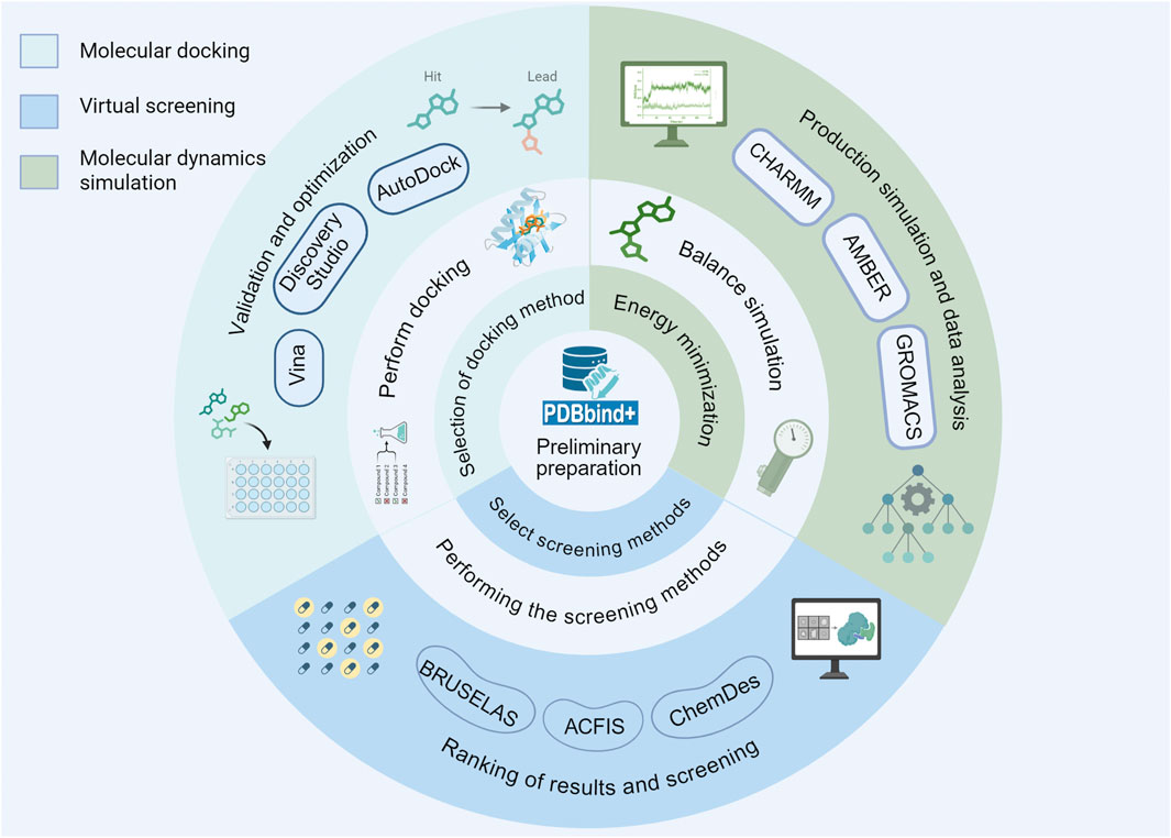 Figure 2. The fundamental procedures of molecular docking, VS and MD simulation involve several key stages that are essential for accurate computational modeling.