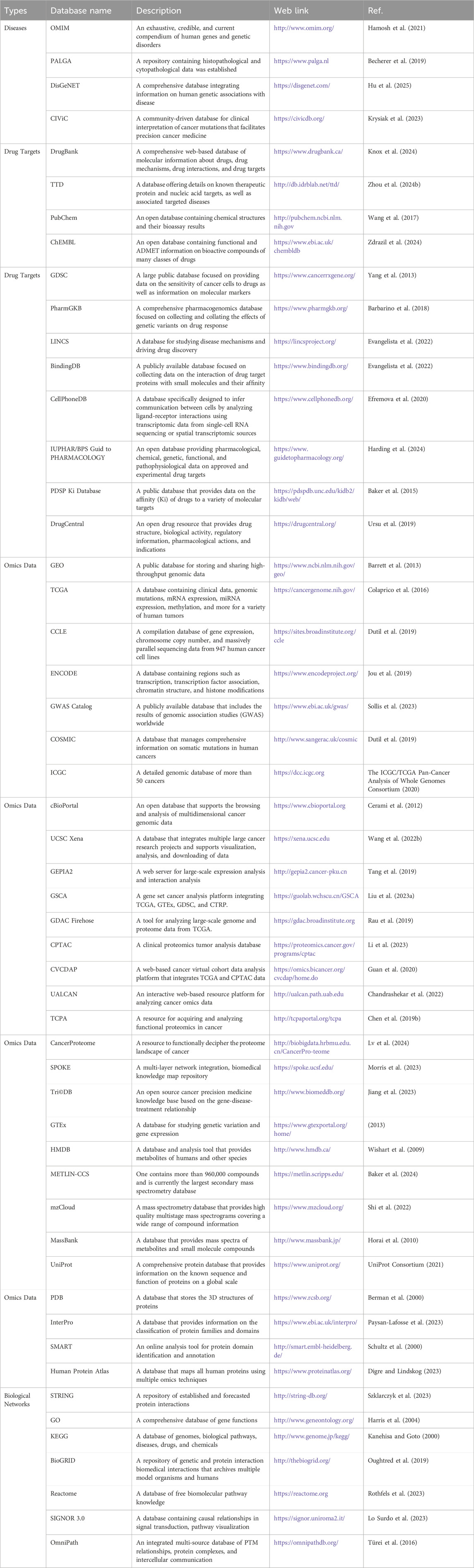 Bioinformatics is an interdisciplinary field that integrates methods and technologies from computer science, mathematics and statistics to acquire, store, manage, analyze, and interpret biological data from genomics, transcriptomics, proteomics, etc., thereby revealing the complexity and functional mechanisms of biological systems and addressing related issues in biology and medicine (Merrick et al., 2011; Simonian, 2021; Shahjahan et al., 2024). The rapid development of this discipline began with the proposal of the Human Genome Project by American scientist Robert Sinsheimer and its subsequent completion, marking the increasing importance of bioinformatics in life sciences (Templeton, 1998). In cancer treatment, bioinformatics helps researchers to accurately identify potential drug targets and prognostic biomarkers by integrating multi-omics data, deeply analyzing and validating the mechanisms of action of drugs and predicting drug resistance, which can significantly improve the precision and effectiveness of treatments (Dong et al., 2019; Rehman et al., 2020; Fang et al., 2022). The bioinformatics tools and technologies in drug discovery mainly include biological databases (Table 1), computer-aided drug design (CADD) and omics technologies (see the omics strategies section) (Zhang et al., 2025).