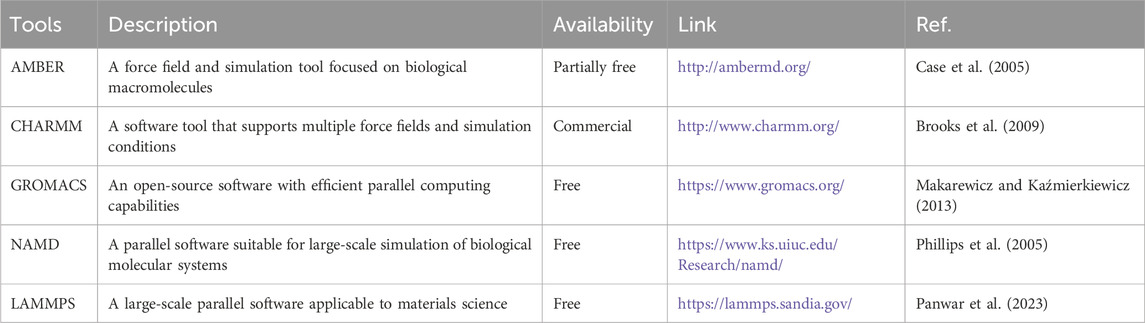The key steps of MD simulation include system construction, energy minimization, equilibrium simulation, and production simulation. First, in the system construction phase, the initial structure of the target molecule (such as a protein-ligand complex) must be determined, and environmental factors such as solvent molecules (e.g., water) and ions must be added. This step typically relies on existing structural information from protein databases (such as Protein Data Bank (PDB)). If the 3D structure of the target protein is unknown, computational methods (such as comparative modeling (Lemer et al., 1995), fold recognition (Jones et al., 1992), or ab initio or de novo modelling (Lesk and Chothia, 1980; Simons et al., 1997)) can be used to predict the structure from its sequence. Next, the energy minimization step optimizes unreasonable conformations in the initial structure to avoid system collapse during the simulation. Subsequently, the equilibrium simulation gradually adjusts temperature and pressure to bring the system to a state of thermodynamic equilibrium. Finally, in the production simulation phase, data is collected under equilibrium conditions for the analysis of dynamic behaviors (such as conformational changes, binding free energy, etc.) (Figure 2; Lei and Duan, 2008; Ulmschneider and Ulmschneider, 2018; Chen et al., 2020). To assess the stability and interactions of protein-ligand complexes, several indicators are commonly used. Root Mean Square Deviation (RMSD) measures the extent of structural deviation in the protein-ligand complex; lower RMSD values indicate greater structural stability. Root mean square fluctuation (RMSF) measures the flexibility of residues, where high fluctuations may destabilize the binding site. Radius of Gyration (Rg) assesses the compactness of the complex. MM/PBSA or MM/Generalized Born Surface Area (GBSA) calculates the binding free energy, providing quantitative estimates of binding affinity. For instance, the binding stability of the LRGFGNPPT peptide with the targets AKT serine/threonine kinase 1 (AKT1), angiotensin-converting enzyme (ACE), and renin (REN) was confirmed by 200 ns MD simulation (Gao et al., 2023; Chen et al., 2024; Hadi et al., 2025). Currently, common MD simulation software (such as AMBER, CHARMM, GROMACS, NAMD and LAMMPS) have versions released that support GPUs computing (Table 2), significantly enhancing simulation efficiency and providing strong support for the dynamic studies of complex systems. Model-driven MD relies on human-established physical formulas for calculating forces. In contrast, data-driven MD uses large datasets and machine learning to model potential energy. The former is interpretable, but it is challenging to extend beyond its predefined functional form. The latter offers high accuracy but requires a large amount of data and validation of its extrapolation capabilities (Jo et al., 2017; Shirts et al., 2017; Fiorin et al., 2024; Kedir et al., 2024).