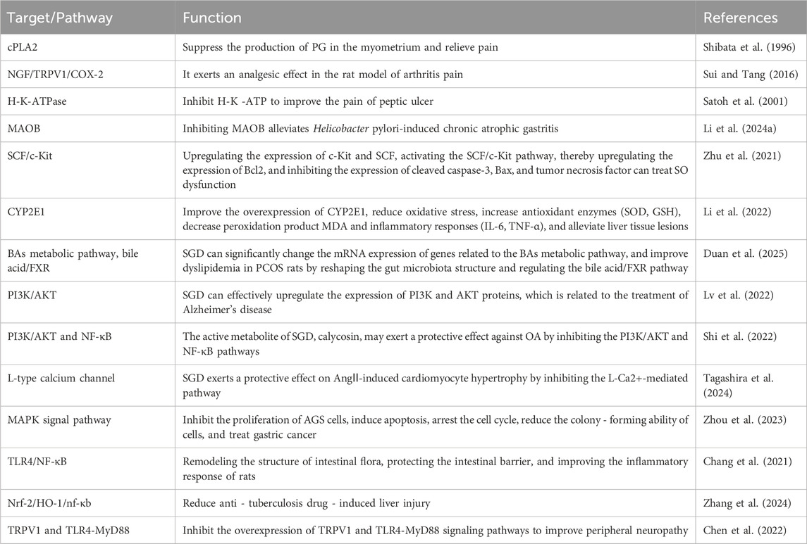 Professor Yuan Yiqing and his team found that SGD (SGD) with modifications for treating acute gastric ulcer can effectively alleviate clinical symptoms, reduce inflammatory response, increase the expression levels of epidermal growth factor (EGF) and epidermal growth factor receptor (EGFR) in gastric mucosa, exert protective effects on gastric mucosa, thereby improving therapeutic efficacy. The drug shows good safety and holds important clinical application value (Yiqing and Xiaojun, 2021). Additionally, studies have revealed that SGD inhibits the activity of H+-K+-ATPase, thereby suppressing gastric acid secretion and improving peptic ulcer (Satoh et al., 2001). SGD also exhibits protective effects against ethanol-induced gastric ulcer in rats. It was found that SGD treatment significantly increased the levels of EGF, prostaglandin E2 (PGE2), superoxide dismutase (SOD), and B-cell lymphoma-2 (Bcl-2) in the gastric tissue of ethanol-induced gastric ulcer rats, while decreasing the levels of tumor necrosis factor-α (TNF-α), thiobarbituric acid reactive substances (TBARS), and caspase-3. These results indicate that SGD can alleviate gastric tissue cell apoptosis in ethanol-induced gastric ulcer rats (Jin et al., 2022).