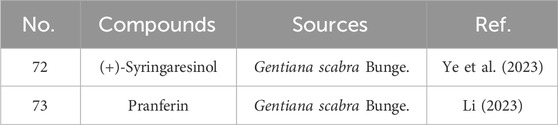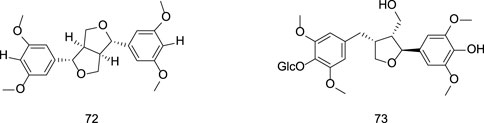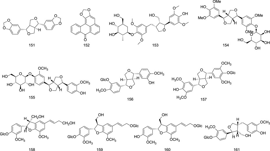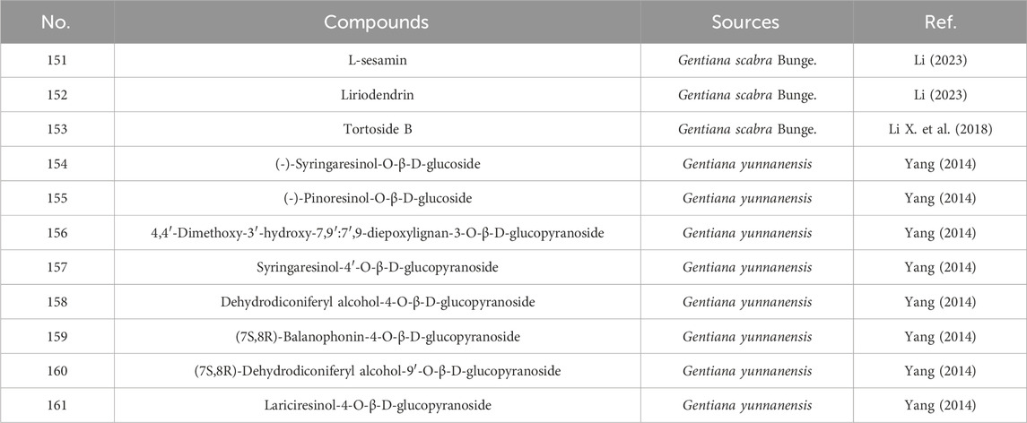 Representative lignans isolated from G. rigescens include L-sesamin (151), liriodendrin (152), tortoside B (153), and lignan glycosides such as (−)-syringaresinol-O-β-D-glucoside (154), (−)-pinoresinol-O-β-D-glucoside (155), syringaresinol-4′-O-β-D-glucopyranoside (157), and lariciresinol-4-O-β-D-glucopyranoside (161) (Liu, 2004; Zhang et al., 2019; Ye et al., 2018). Specific information on lignans constituents from Gentianae Radix et Rhizoma can be found in Table 6 and Figure 6.