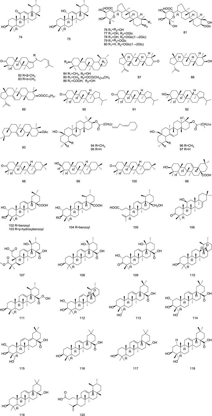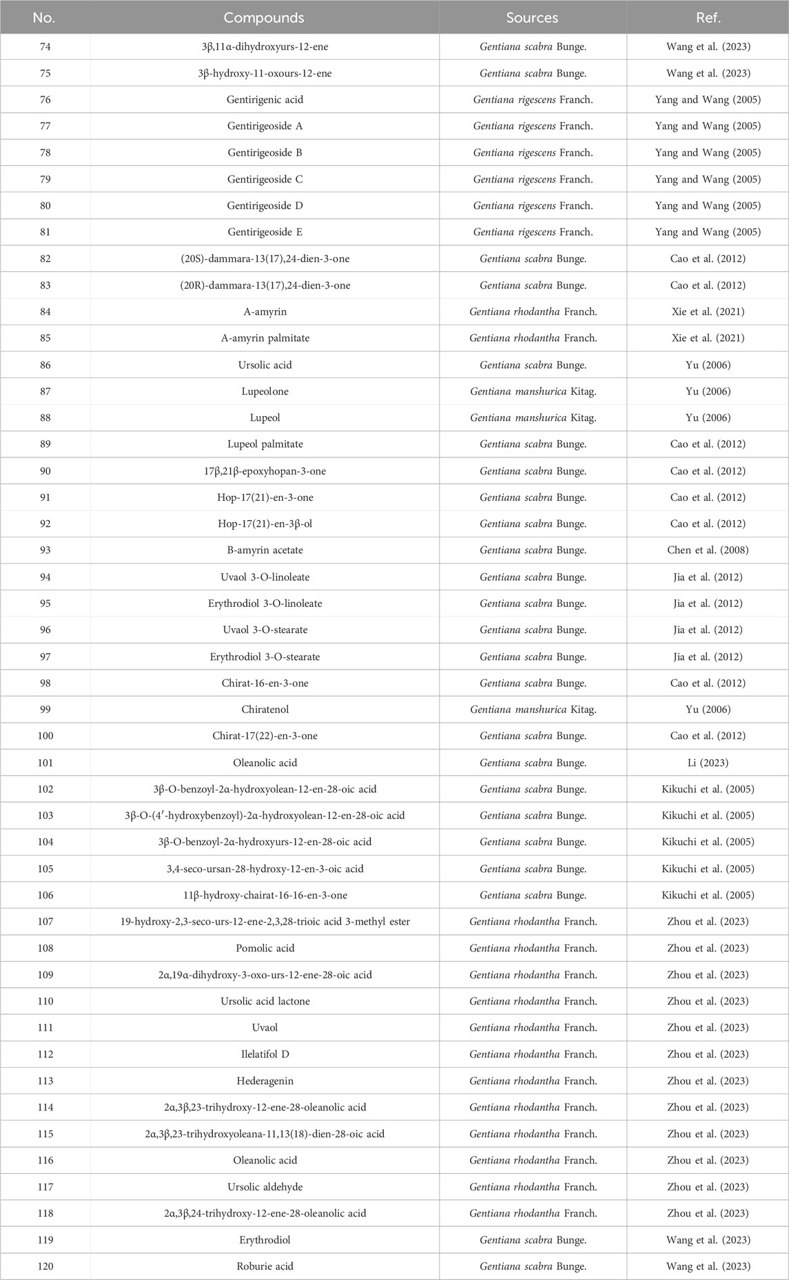 Triterpenoids isolated from Gentiana plants mainly include dammarane-type compounds, characterized by a β-configured angular methyl group at the C-8 position, such as gentirigenic acid (76), gentirigeoside A (77), and gentirigeoside B (78); ursane-type compounds, with A/B, B/C, and C/D rings in a trans configuration and D/E rings mostly in a cis configuration, such as α-amyrin (84), α-amyrin palmitate (85), and ursolic acid (86); and lupane-type compounds, featuring a five-membered E ring with isopropyl substitution, such as 17β,21β-epoxyhopan-3-one (90), hop-17 (21)-en-3-one (91), and hop-17 (21)-en-3β-ol (92). Specific information on triterpenoid constituents from Gentianae Radix et Rhizoma can be found in Table 4 and Figure 4. Additionally, purified dammarane-type triterpenoids from Gentiana rigescens exhibited in vitro antifungal activity against Glomerella cingulata (inhibition zones: 0.8–2.0 cm) in a disk diffusion assay at 1 mg/mL, with Carbendazim as a positive control after 72 h of incubation (Xu et al., 2007).