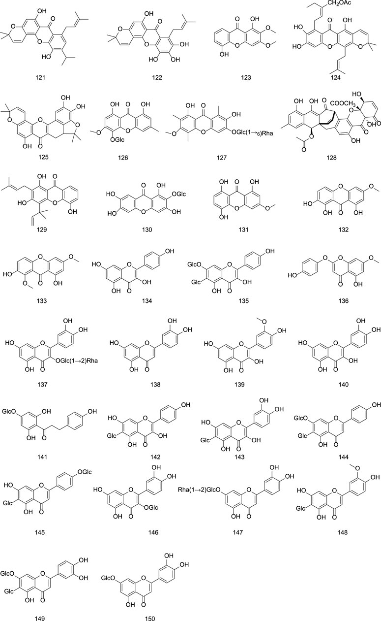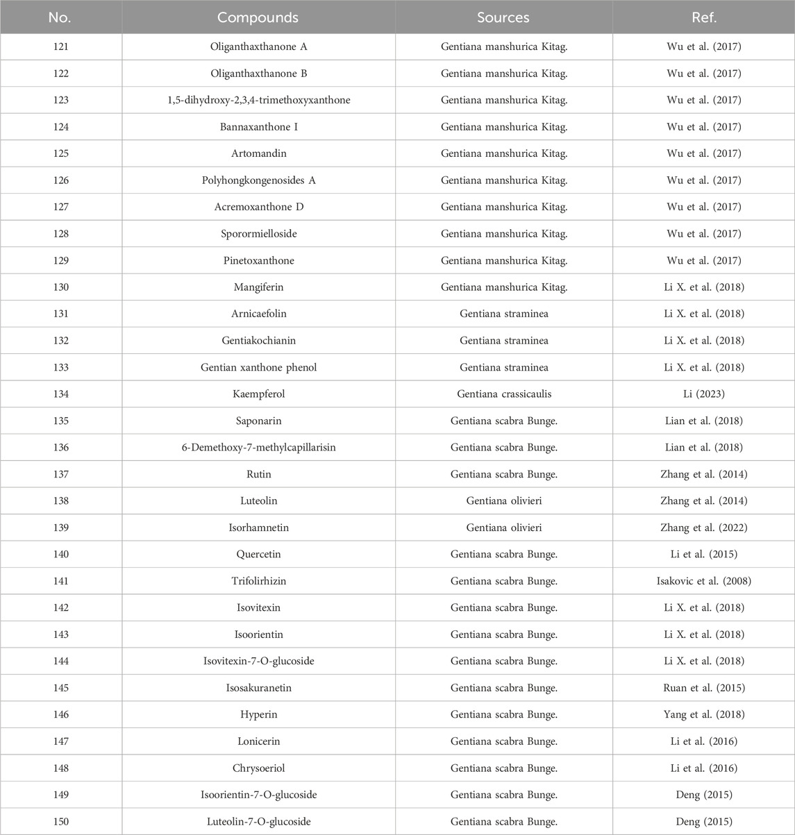 The flavonoid constituents in G. rigescens are primarily composed of benzochromones and flavonoid glycosides. Representative compounds include oliganthaxthanone A (121), pinetoxanthone (122), mangiferin (130), luteolin (138), kaempferol (134), quercetin (140), isoorientin (142), isovitexin (143), and their derivatives (Liu, 2004; Zhou et al., 2017; Wang, 2015; Yu, 2006; Olennikov et al., 2015). as shown in Table 5 and Figure 5.