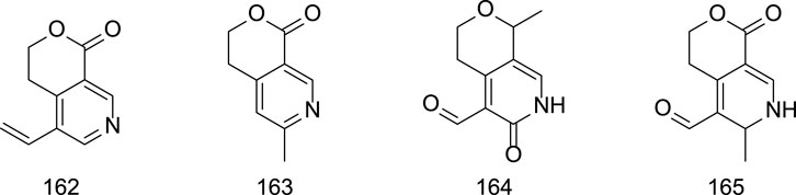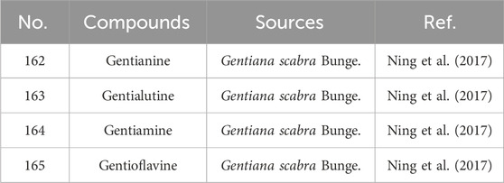 Since the 1950s, several alkaloids, including gentianine (162), gentialutine (163), gentiamine (164), and gentioflavine (165), have been isolated from G. rigescens (Sun and Xia, 1984). However, studies suggest that these alkaloids may not be naturally occurring in the plant but rather artifacts formed during extraction. For instance, gentianine and gentialutine are proposed to arise from the conversion of gentiopicroside in the presence of ammonia during processing. Such interconversions between constituents not only influence the diversity and abundance of alkaloids but also modulate their pharmacological profiles. For example, gentianine exhibits significant anti-inflammatory, sedative, and antibacterial activities, whereas its precursor gentiopicroside primarily demonstrates hepatoprotective, anti-inflammatory, and immunomodulatory effects (Ning et al., 2017). Specific information on alkaloids constituents from Gentianae Radix et Rhizoma can be found in Table 7 and Figure 7.
