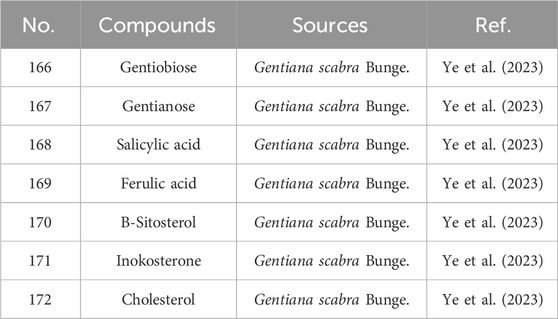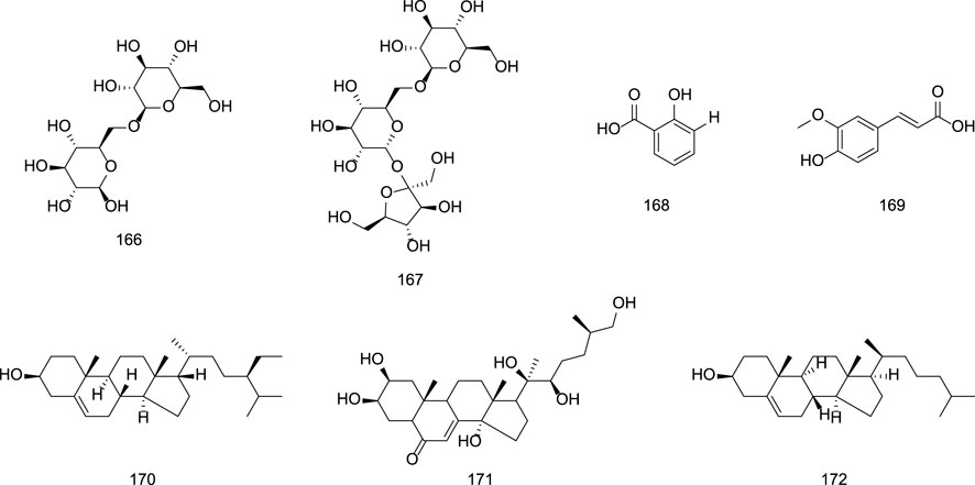 Beyond terpenoids, flavonoids, lignans, and alkaloids, Gentianae Radix et Rhizoma contain diverse secondary metabolites. Polysaccharides such as gentiobiose (166) have been isolated (Wang, 2014; Jiang et al., 2008). Phenolic acids, including salicylic acid (168) and ferulic acid (169), are also documented (Liu, 2004). Additionally, Gentiana contains amino acids (e.g., threonine, valine, methionine) and essential minerals such as calcium (Ca), copper (Cu), iron (Fe), zinc (Zn), and manganese (Mn) (Ye et al., 2023). Steroidal compounds, including β-sitosterol (170) and inokosterone (171), have been identified (Zhao et al., 2009; Guo and Piao, 2011). The specific information is presented in Table 8 and Figure 8.