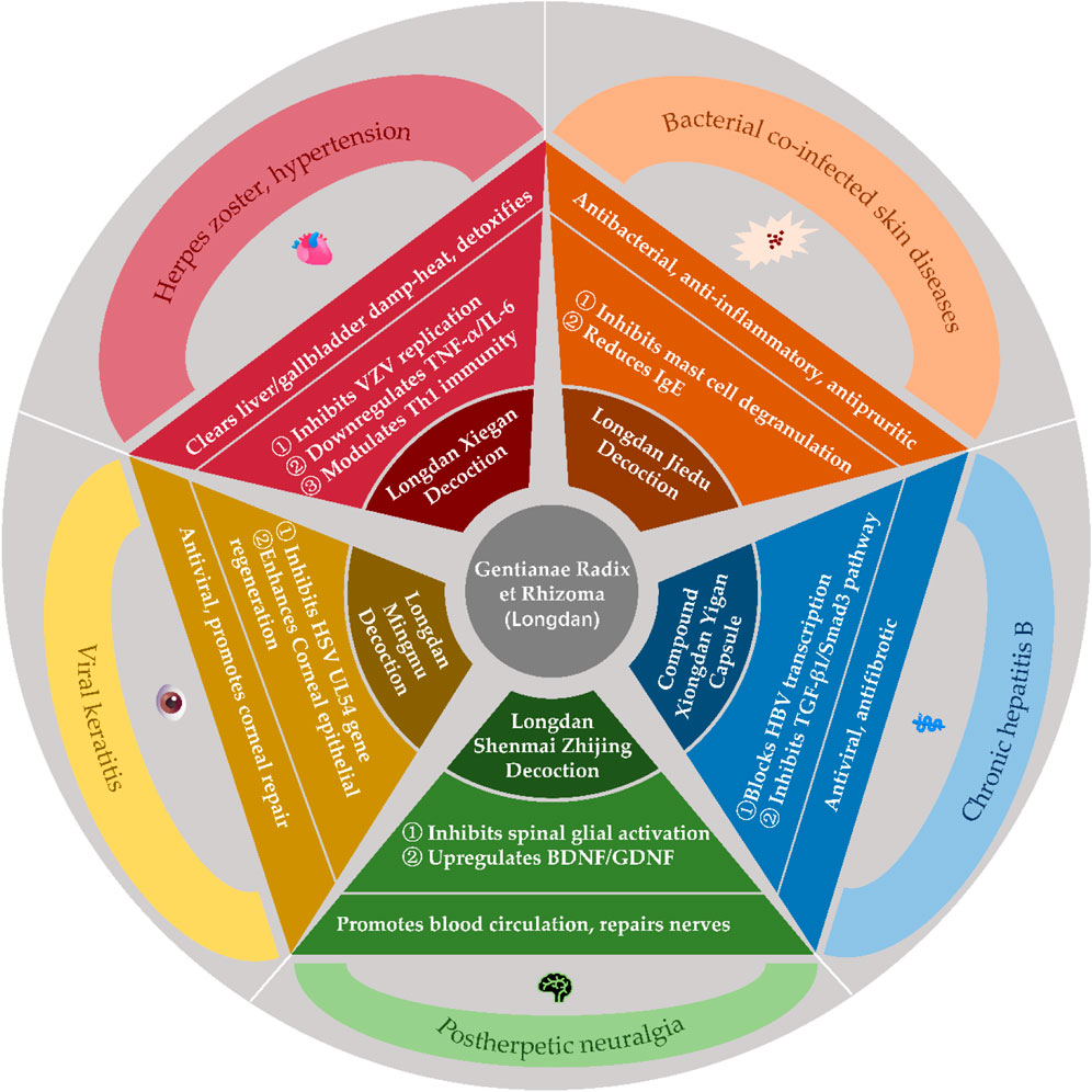 Longdan Xiegan Tang (Gentian Liver-Draining Decoction) (Cao, 2022; Wu and Chen, 2022; Zhang and Zhang, 2018): Combining Gentianae Radix et Rhizoma (as the sovereign herb) with Scutellaria and Gardenia, this formula alleviates herpetic pain and accelerates crust formation.