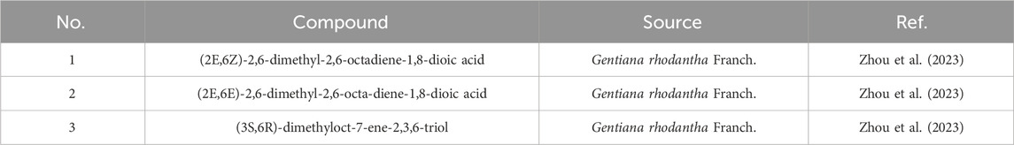 For Gentianae Radix et Rhizoma are rich in diverse chemical constituents, primarily including terpenoids (iridoids and triterpenoids), flavonoids, lignans, and alkaloids. Among these, iridoids such as gentiopicroside, swertiamarin, and sweroside are not only the most abundant phytochemicals in Gentianae Radix et Rhizoma but also serve as key bioactive components responsible for their pharmacological activities (Song, 1986; Ye et al., 2023). Unless otherwise specified, all chemical constituents discussed in this section were isolated from roots/rhizomes, as defined in the Chinese Pharmacopoeia (2020). Compounds one to three were isolated from flowers of Gentiana rhodantha Franch. (non-pharmacopeial species), included for comparative chemical profiling.