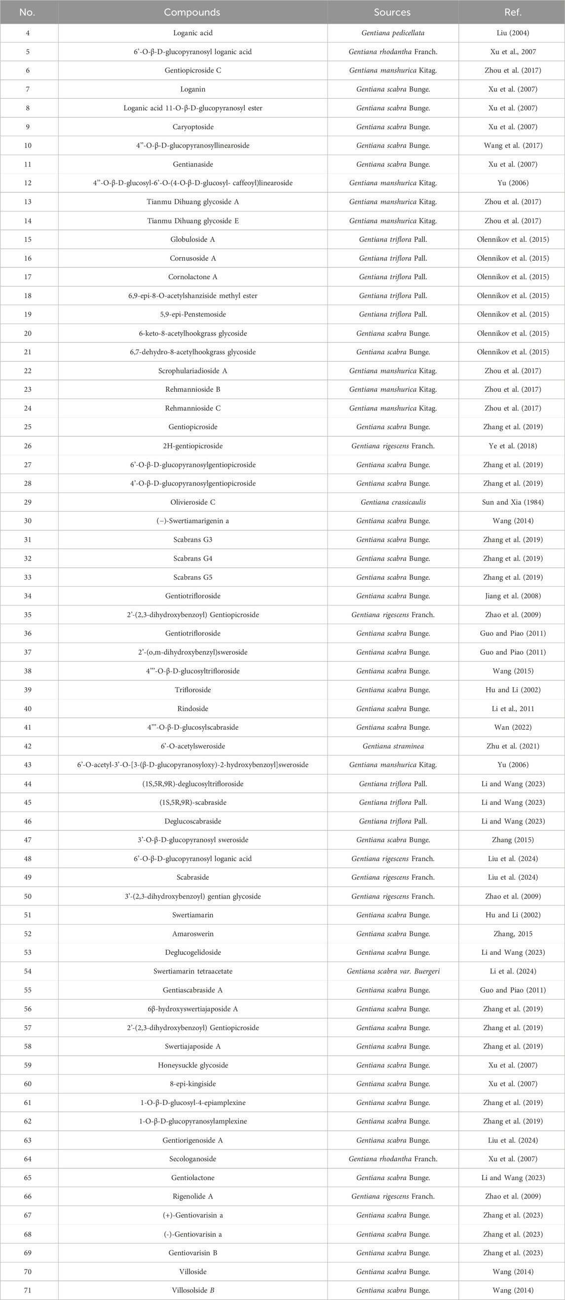 The majority of iridoid components in Gentianae Radix et Rhizoma are secoiridoids, which are commonly glycosylated at the C-1 position. The isolated iridoids are primarily classified into regular iridoids, 4-demethylated iridoids, and secoiridoids (Ye et al., 2023). The regular iridoids include loganic acid (4), 6′-O-β-D-glucopyranosyl loganic acid (5), and loganin (7); the 4-demethylated iridoids include Scrophulariadioside A (22), Rehmannioside B (23), Rehmannioside C (24); and the secoiridoids include gentiopicroside (25), Gentiotrifloroside (36), and Swertiamarin (51). For detailed information on the iridoid components in Gentianae Radix et Rhizoma, refer to Table 2 and Figure 2.