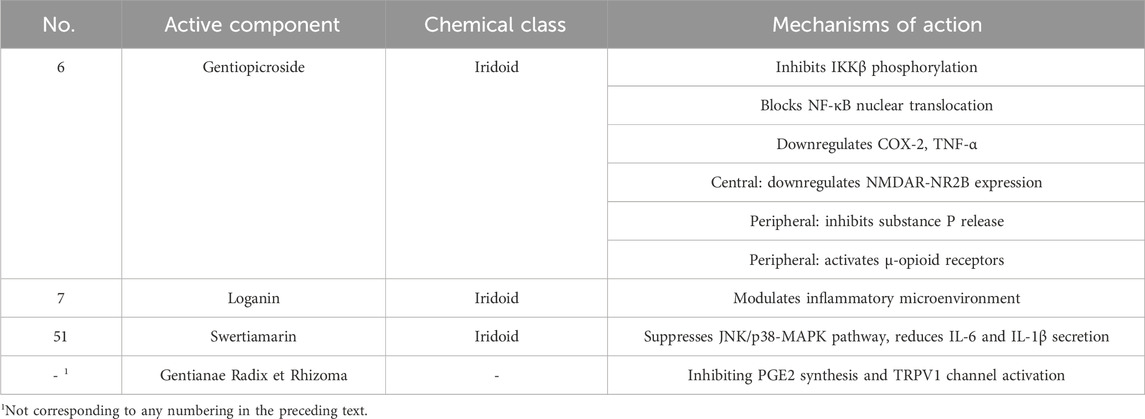 Table 9. Anti-inflammatory and analgesic compounds in Gentianae Radix et Rhizoma: Bioactive components and mechanisms of action.