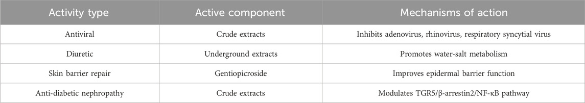 In vivo studies in normal, glucose-hyperglycemic, and streptozotocin-induced diabetic rats demonstrated that the ethyl acetate fraction of a methanol extract of Gentiana olivieri aerial parts, and its isolated active constituent isoorientin (doses: 7.5–30 mg/kg), significantly reduced blood glucose levels, with a minimal effective dose of 15 mg/kg; positive controls included tolbutamide, negative controls received vehicle, and treatment durations ranged from acute (four to six h) to subacute (15 days) administration (Sezik et al., 2005). Gentianae Radix et Rhizoma extracts and have demonstrated the ability to reduce the activity of hepatic enzymes such as alanine aminotransferase, aspartate aminotransferase, and alkaline phosphatase, as well as modulate the bile acid receptor G protein-coupled bile acid receptor 1 (TGR5)/β-arrestin2/NF-κB signaling pathway, thereby delaying the progression of diabetic nephropathy in mice fed a high-fat diet (Ghazanfar et al., 2017; Xi et al., 2020). Gentiopicroside can be utilized to improve skin conditions with impaired epidermal barriers (Wölfle et al., 2017); it also inhibits adipogenesis by modulating the 3T3-L1 pathway (Choi et al., 2019). Gentianae Radix et RhizomaBunge. Exhibits significant activity against adenovirus type 5 (C type), human rhinovirus type B (subtype 14), and respiratory syncytial virus; the underground parts of Gentianae Radix et Rhizoma possess diuretic effects (You, 2017). The other bioactivities of Gentianae Radix et Rhizoma are presented in Table 15.