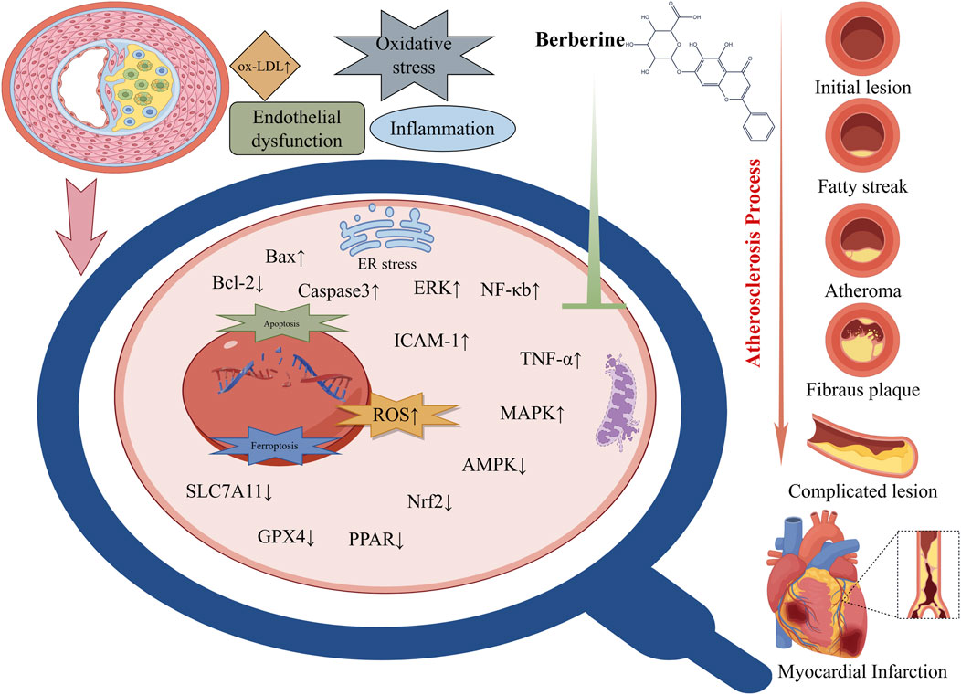 Illustration showing the process of atherosclerosis and potential effects of berberine. It details cellular mechanisms like oxidative stress, inflammation, and endothelial dysfunction, highlighting increases in factors such as ox-LDL, Bax, Caspase3, and ROS. The diagram also lists stages of atherosclerosis: initial lesion, fatty streak, atheroma, fibrous plaque, leading to a complicated lesion and myocardial infarction. Berberine is indicated as having various molecular effects. The image includes chemical structures and cellular organelles.
