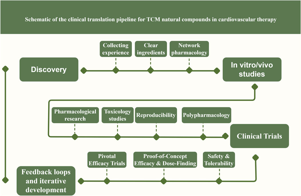 Schematic diagram illustrating the clinical translation pipeline for Traditional Chinese Medicine (TCM) natural compounds in cardiovascular therapy. It includes stages such as discovery, in vitro/in vivo studies, and clinical trials. The process involves collecting experience, identifying clear ingredients, network pharmacology, pharmacological research, toxicology studies, reproducibility, polypharmacology, pivotal efficacy trials, proof-of-concept efficacy and dose-finding, and safety and tolerability, with feedback loops for iterative development.